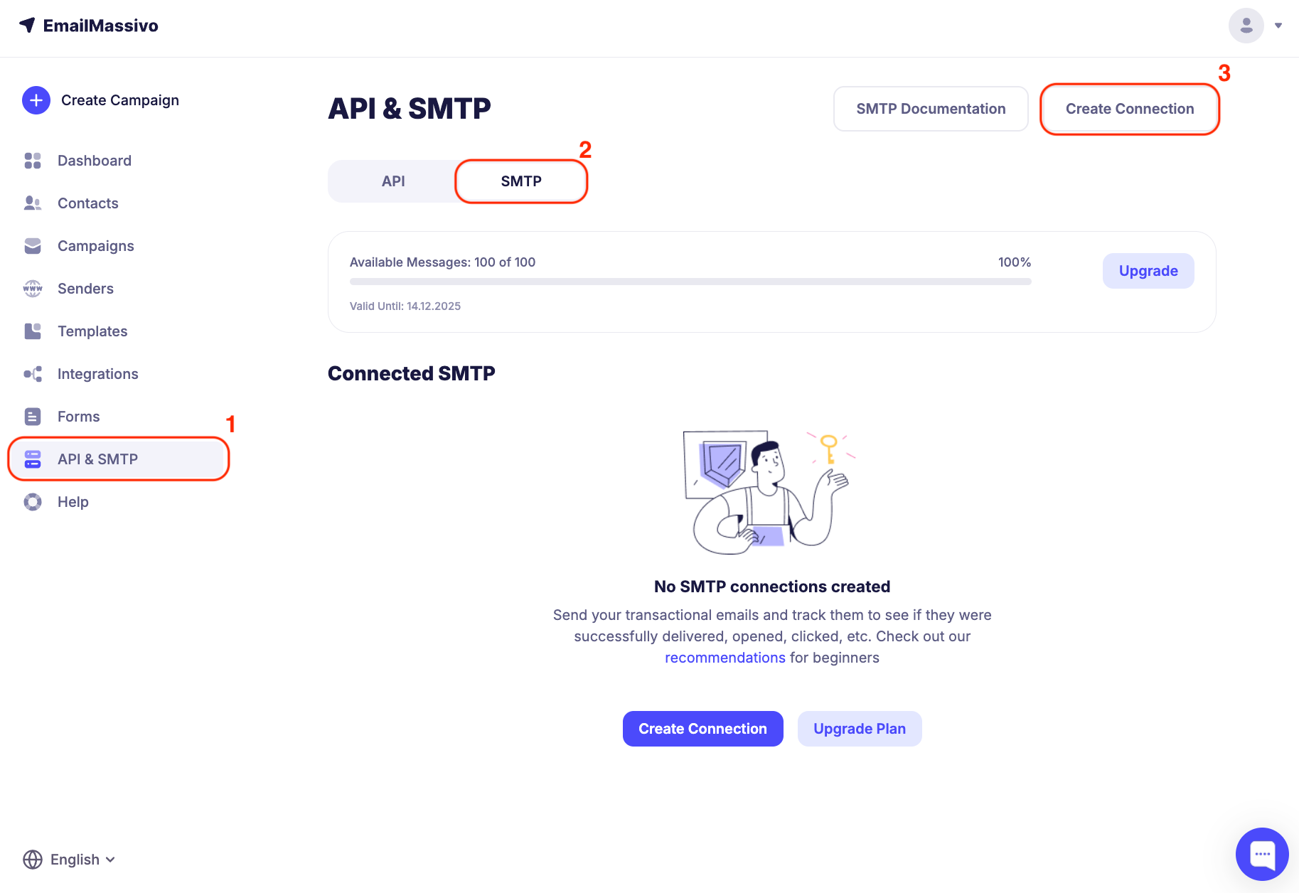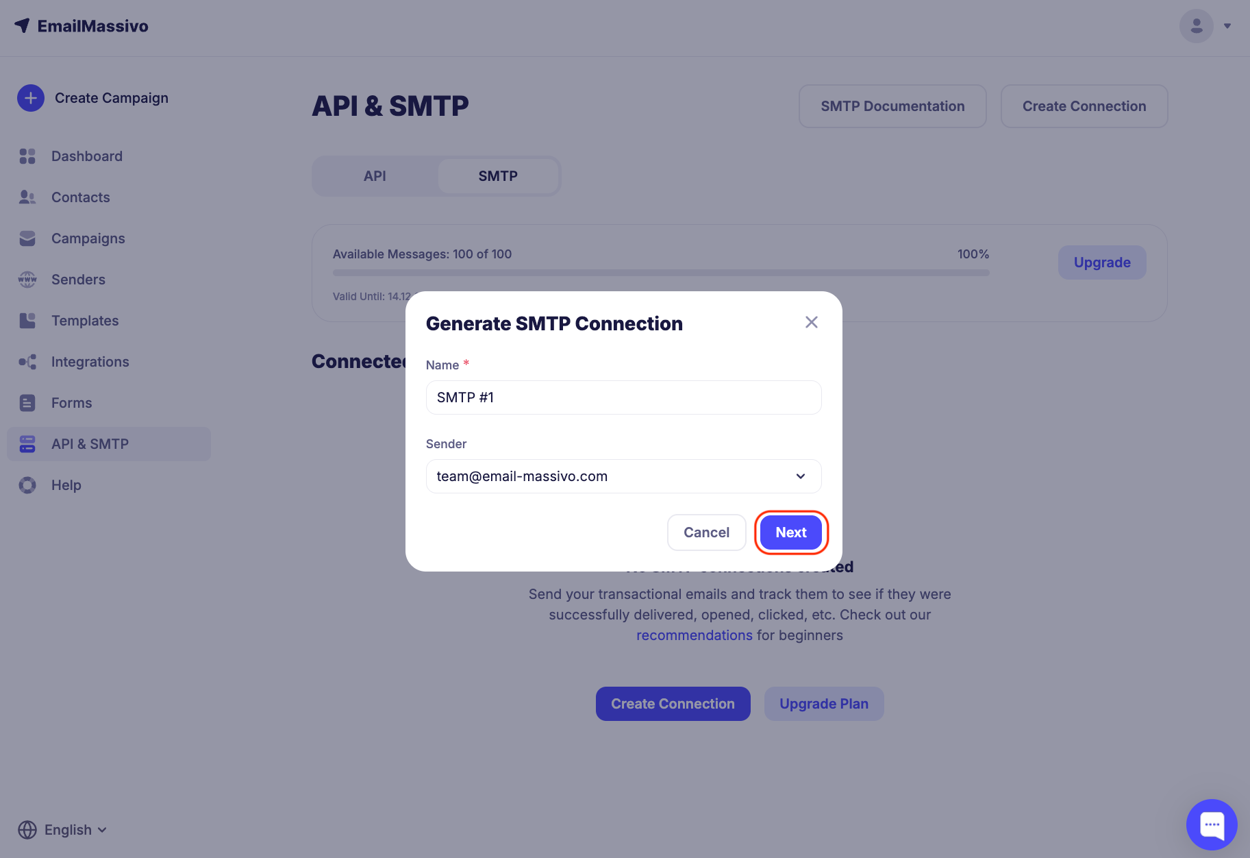 To create a connection, go to the "API and SMTP" → "SMTP" → "Create Connection" section.