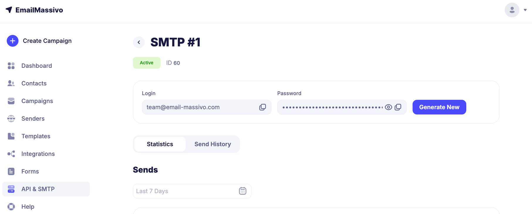 For SMTP connection, you will need a login and password. To get your login and password, go to the card by clicking on the name of the desired connected SMTP and copy the data. If necessary, you can generate a new password.