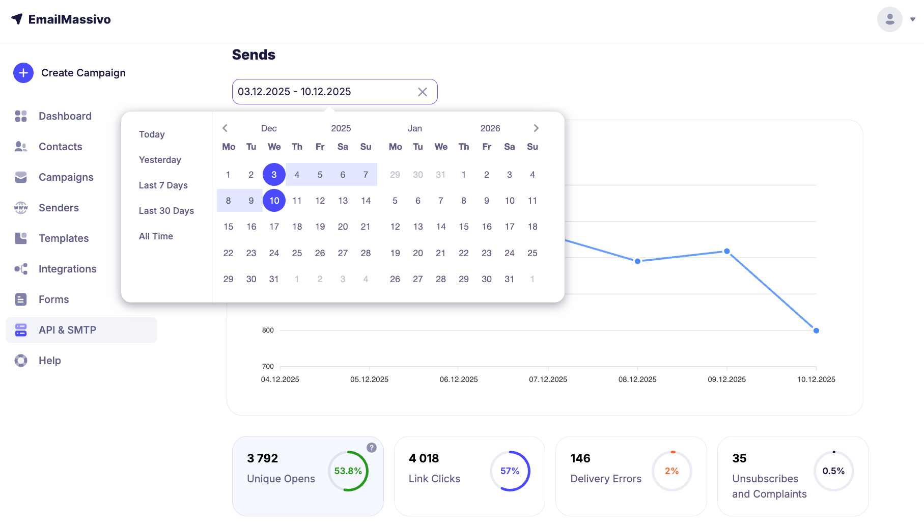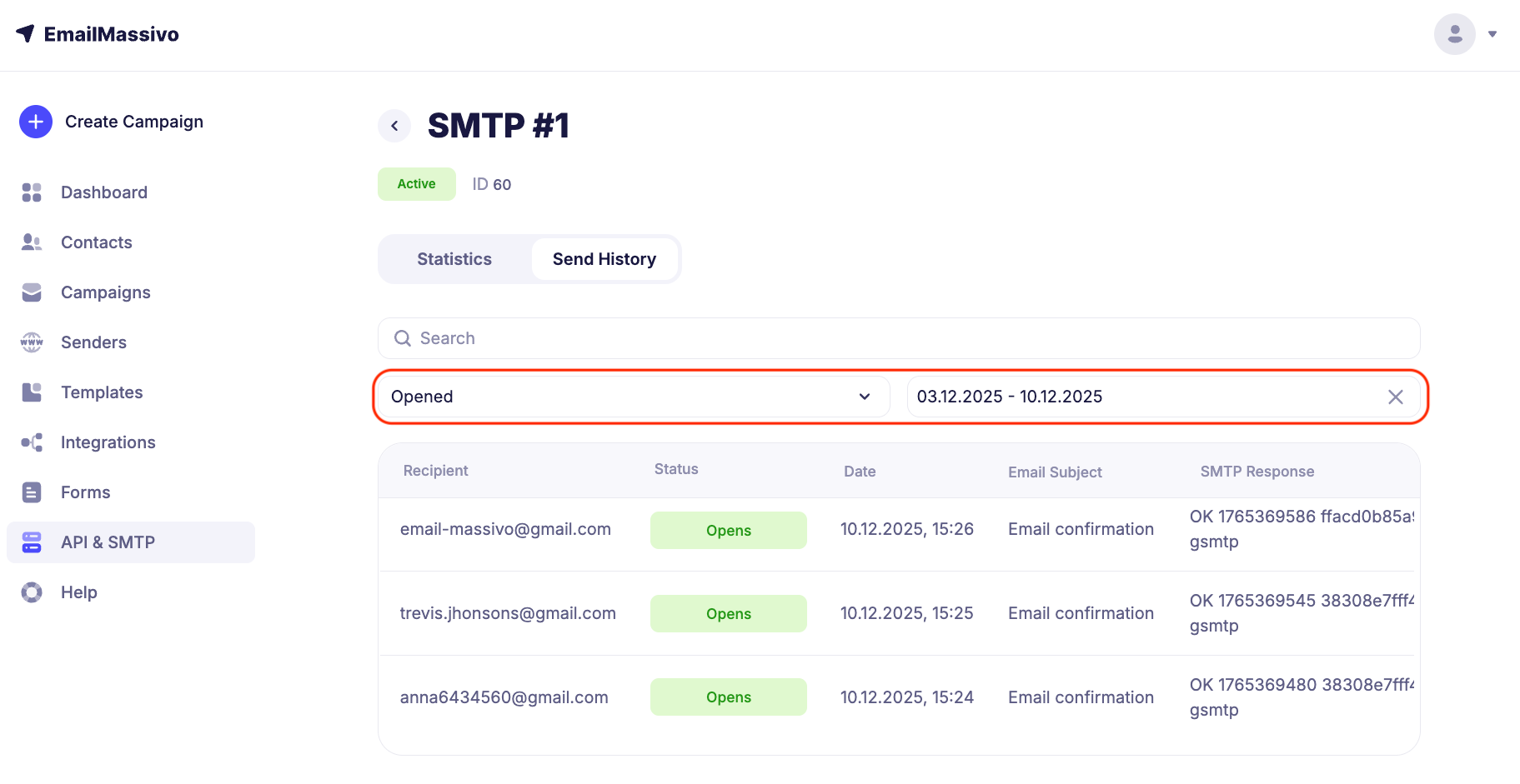 To view statistics for connected SMTP, go to the "API and SMTP" → "SMTP" section and select the desired SMTP connection.