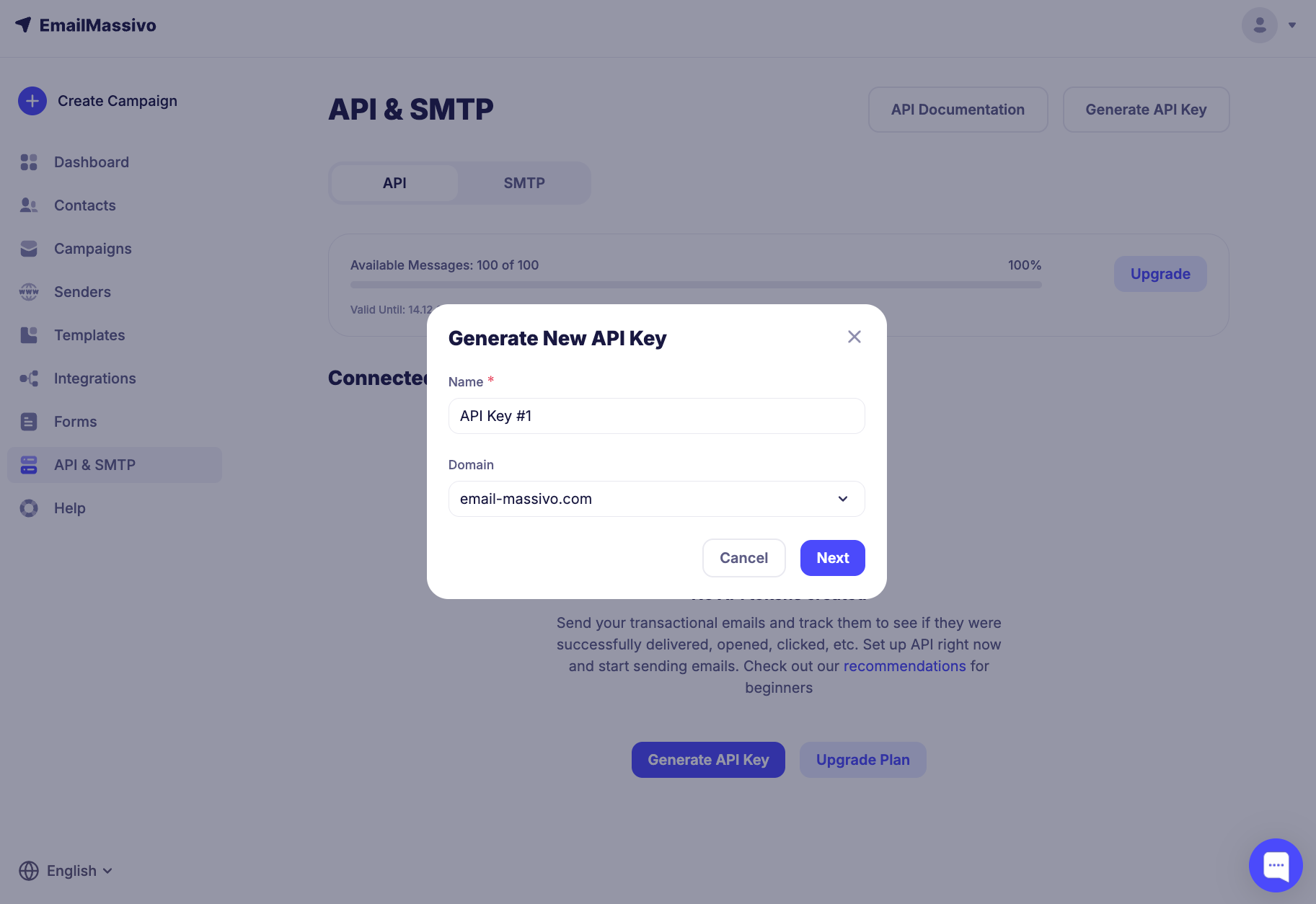 To activate the API key, you need to contact support or write to the support chat on the website dashboard. You will be asked to specify for which project and for what purposes the API key will be used, as well as the approximate number of emails for sending. The activation process will take 5-10 minutes.