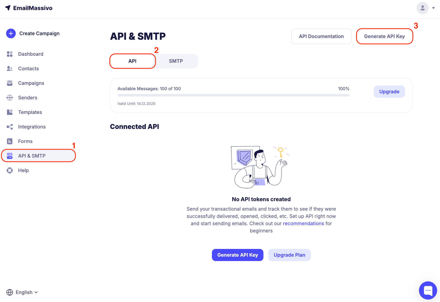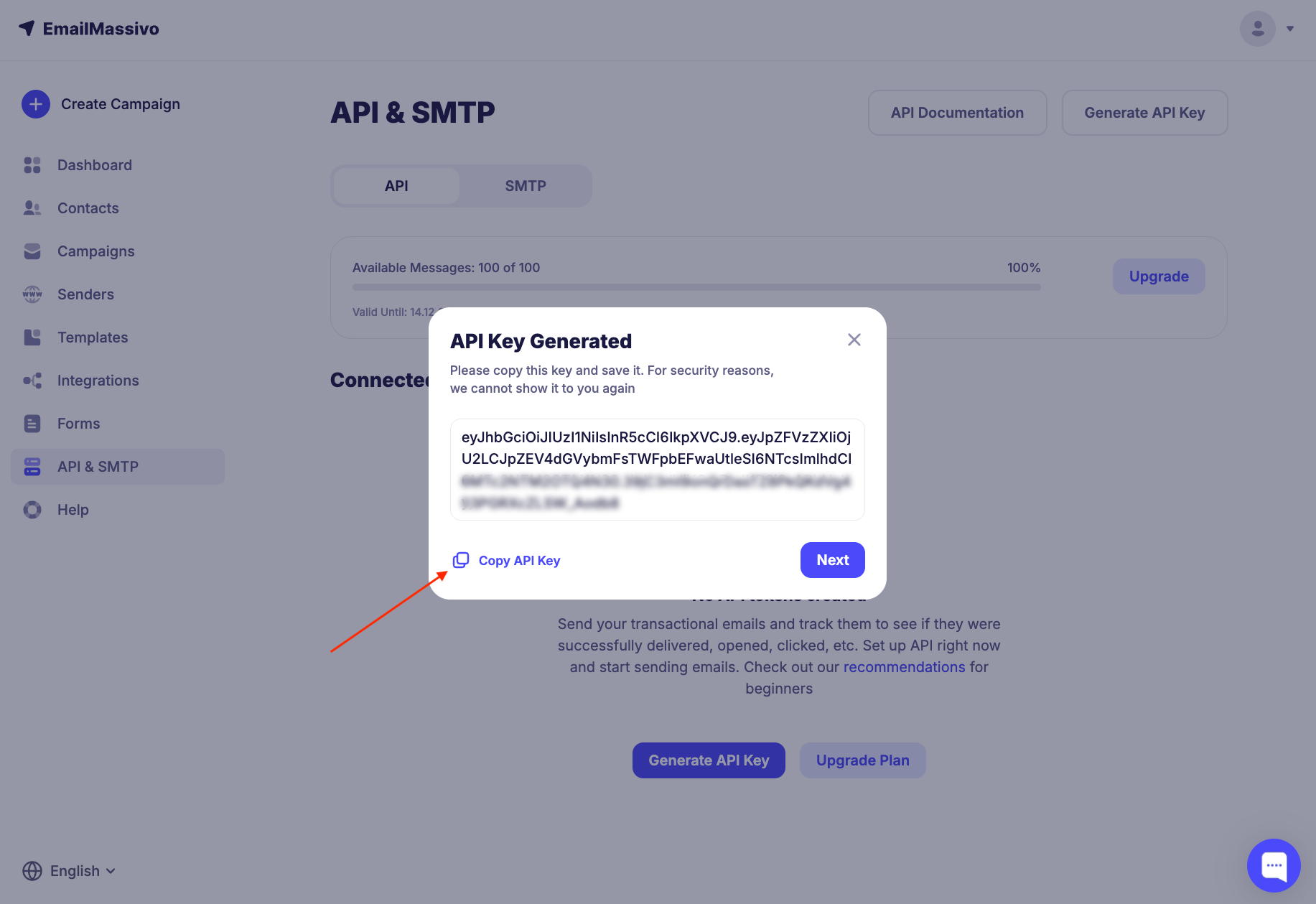 Go to the "API" section and click the "Generate API Key" button.