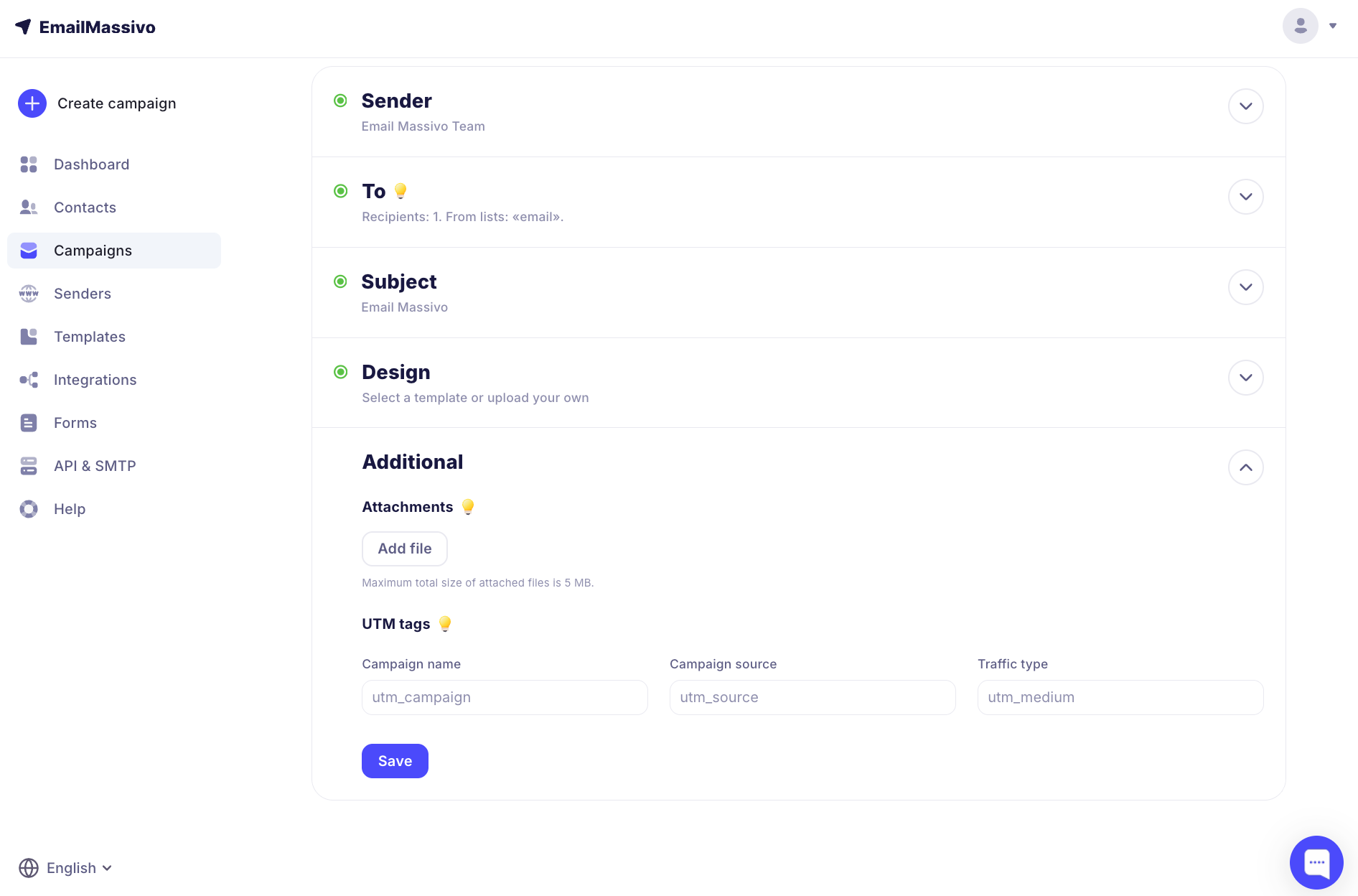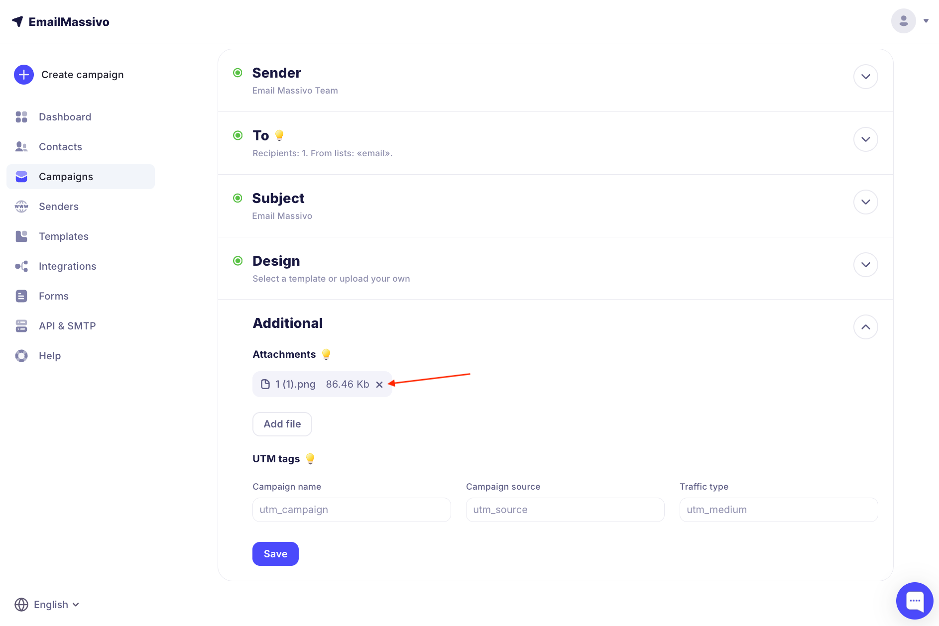 When creating a campaign, you can attach one or more files to it. To do this, at the campaign creation stage, in the "Advanced" tab, click "Add file".
