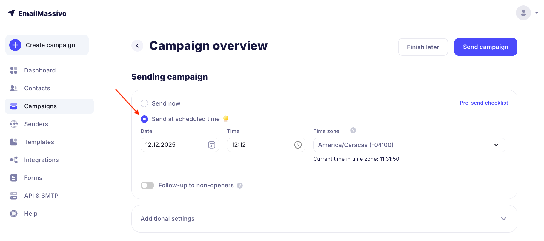 At the "Campaign Overview" stage, select "Send at scheduled time". Set the time, date, timezone, and click the "Send Campaign" button.