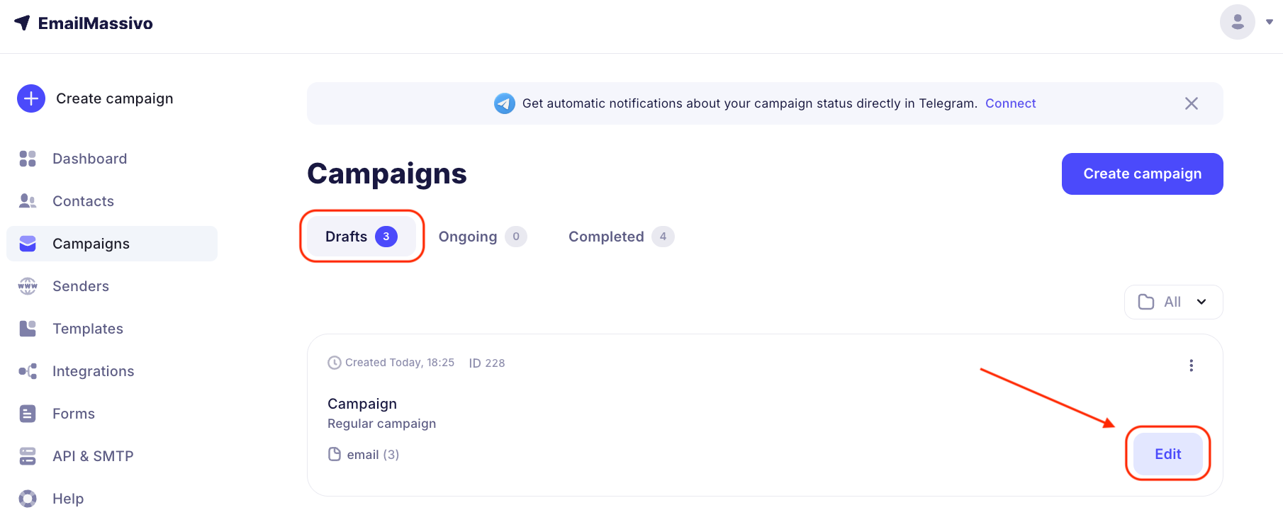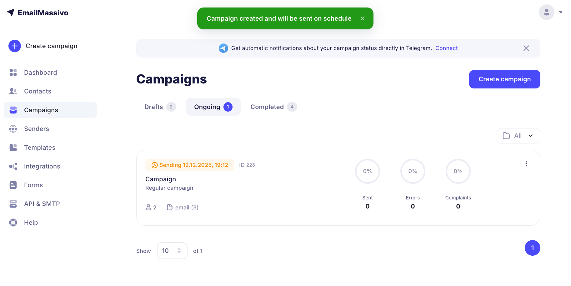 Now your campaign will be queued for sending. Before sending, it will go for moderation and will be sent at the scheduled time if it successfully passes verification. After sending, the campaign will move to "Completed".