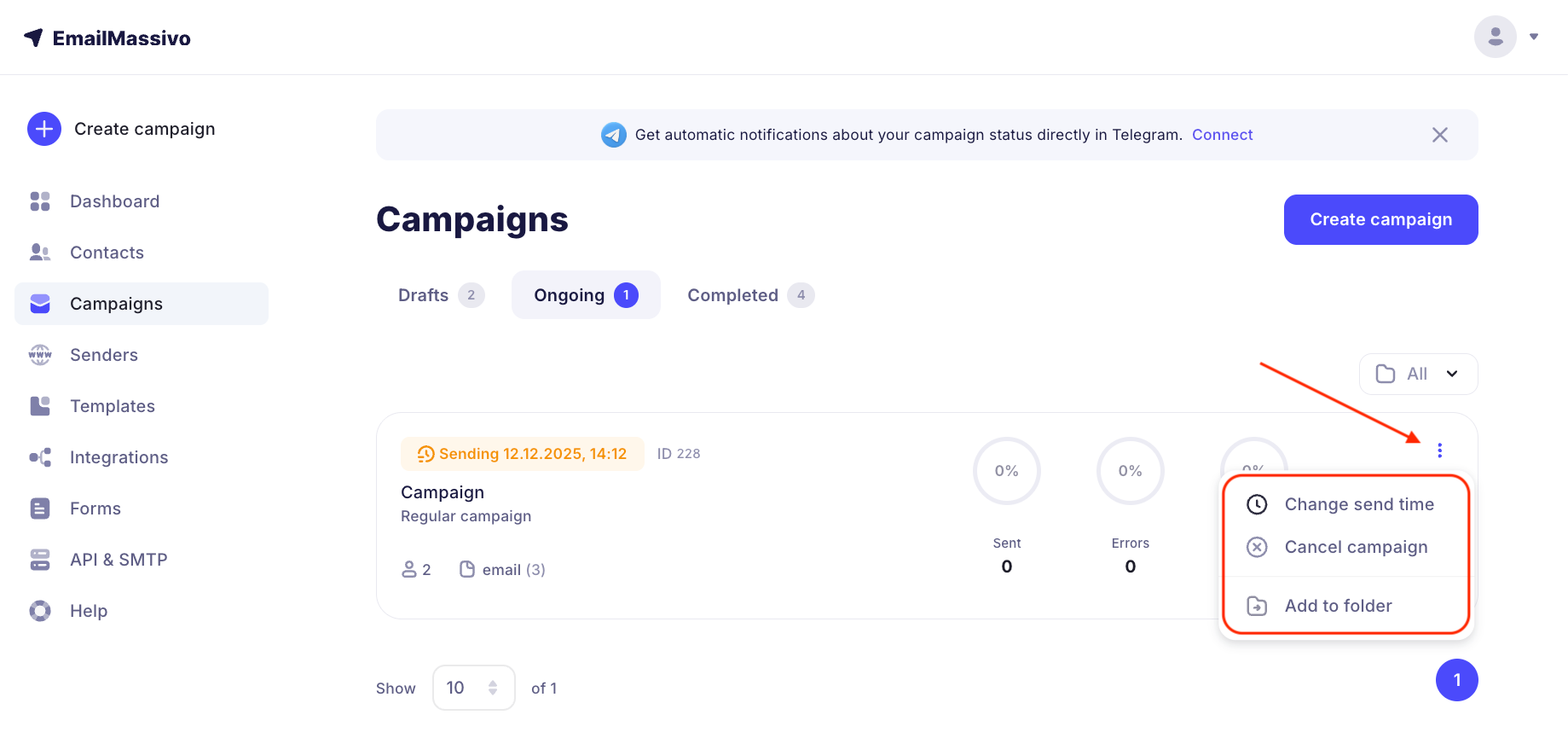 A scheduled campaign cannot be modified, but you can adjust the send time or cancel sending. If you want to make changes, first cancel the campaign sending in the "Campaigns" → "In Progress" section.