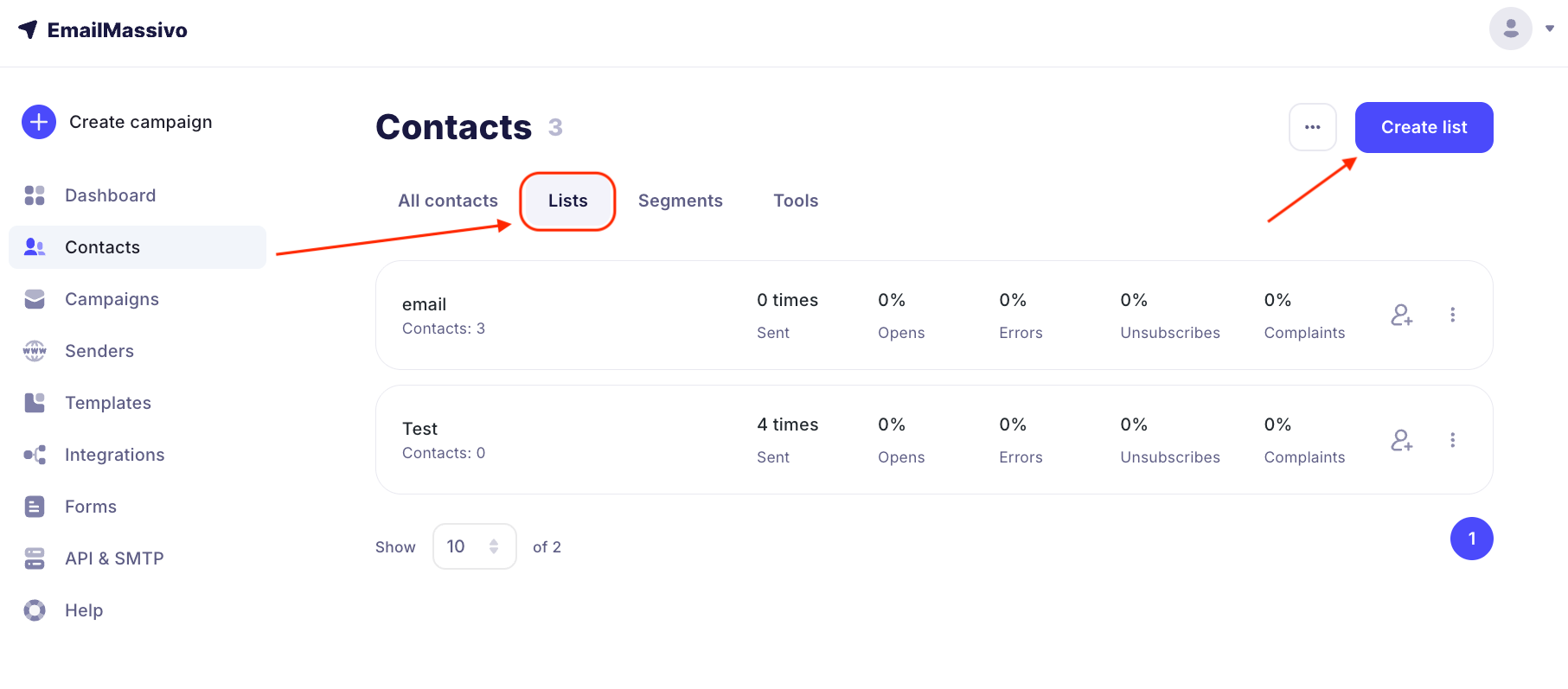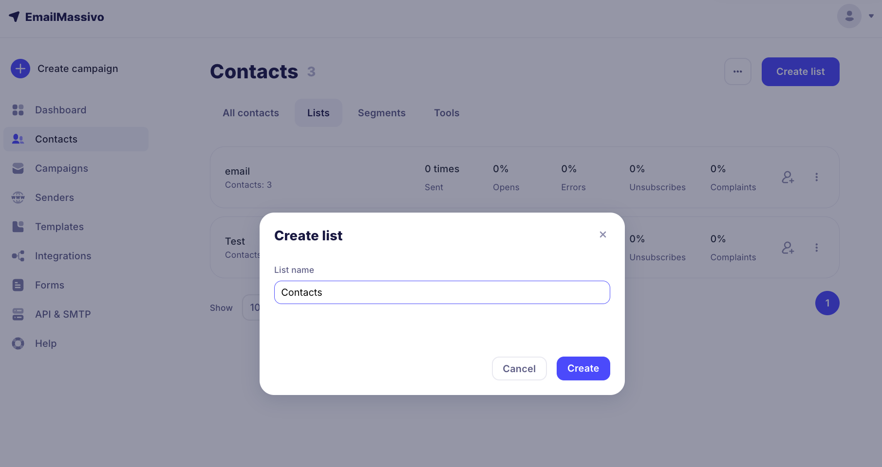 Go to the "Contacts" section in the "Lists" tab and click "Create List".