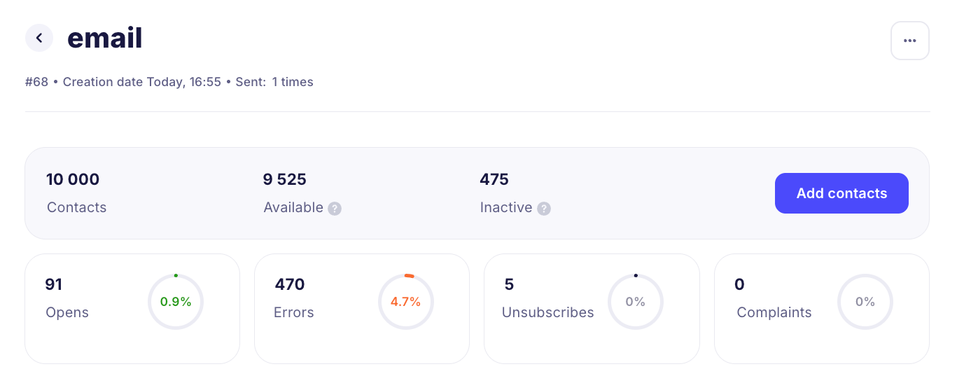 - for each list, you can view statistics: find out the open rate, as well as the percentage of errors and unsubscribes of contacts within the list: