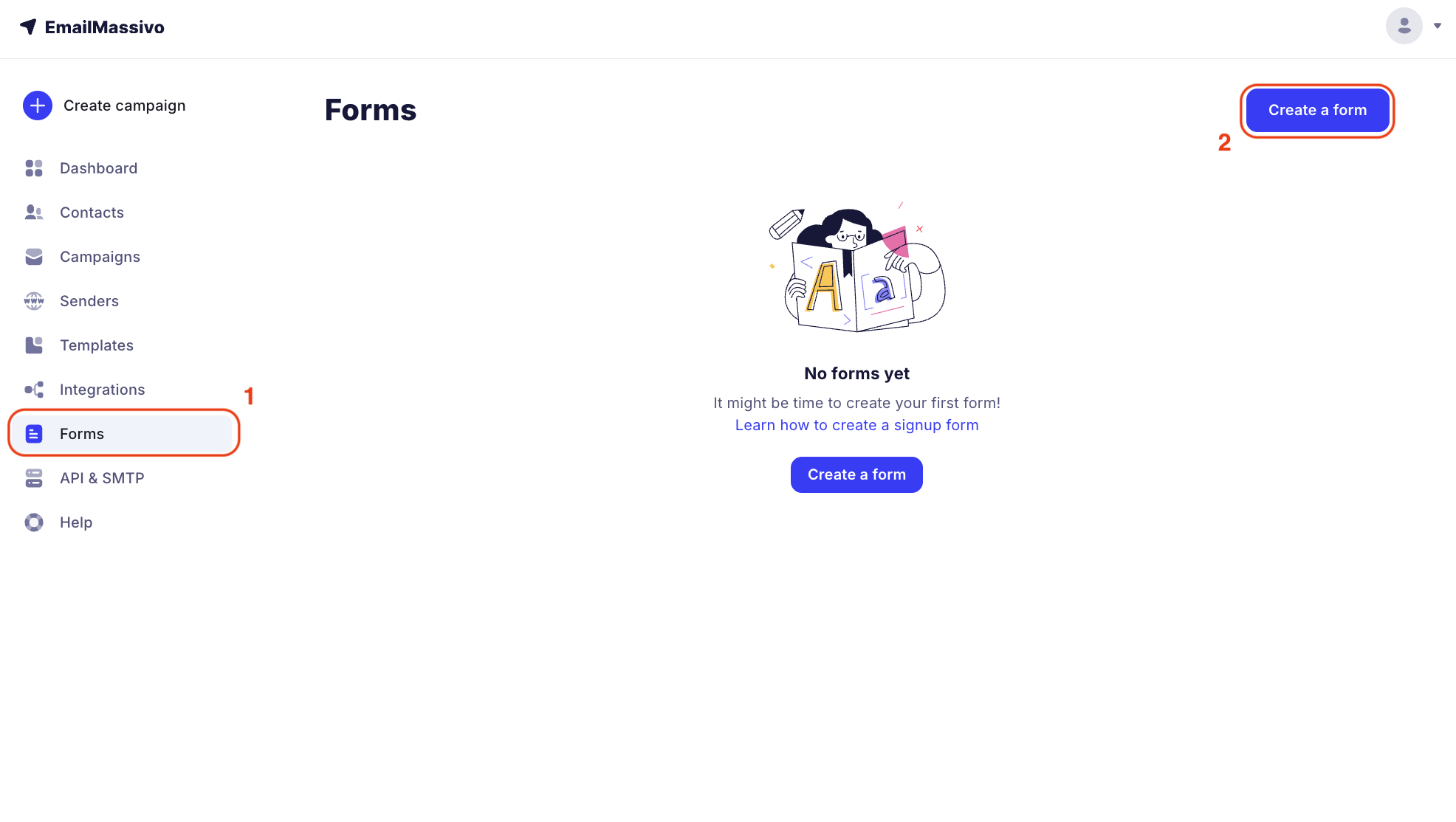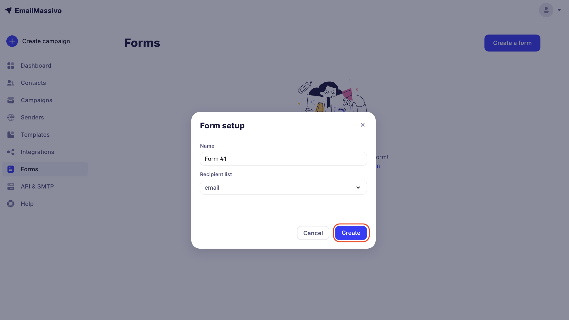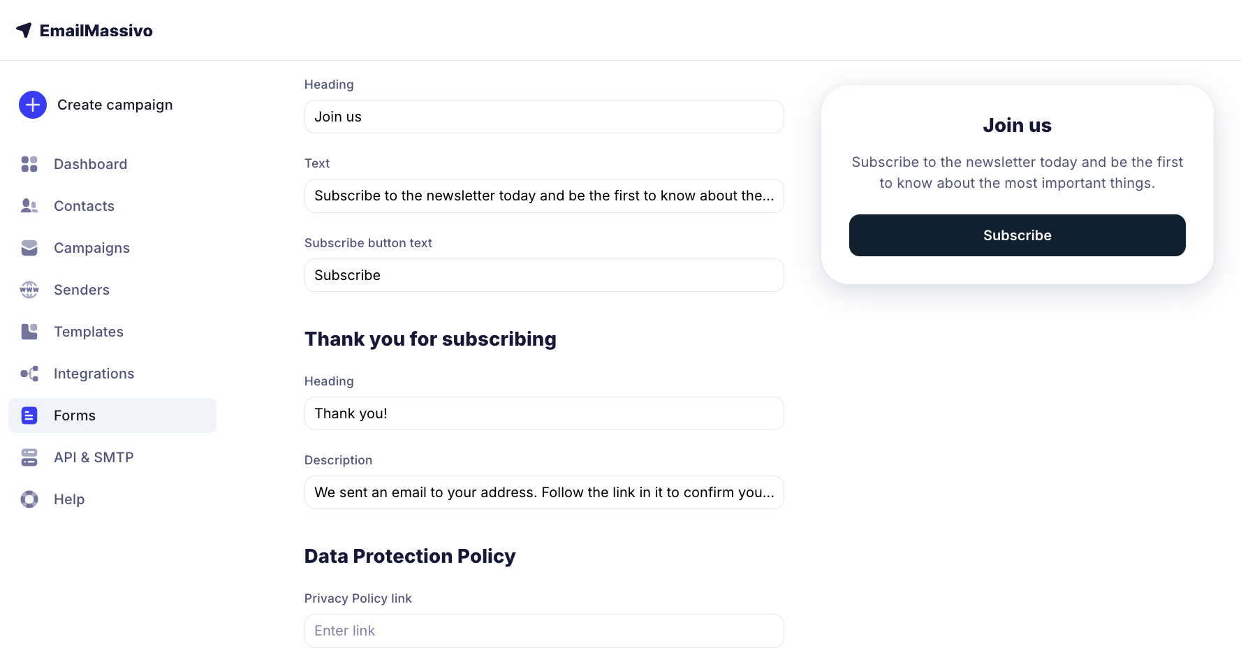 To start creating a subscription form, go to the "Forms" section and click the "Create a form" button.