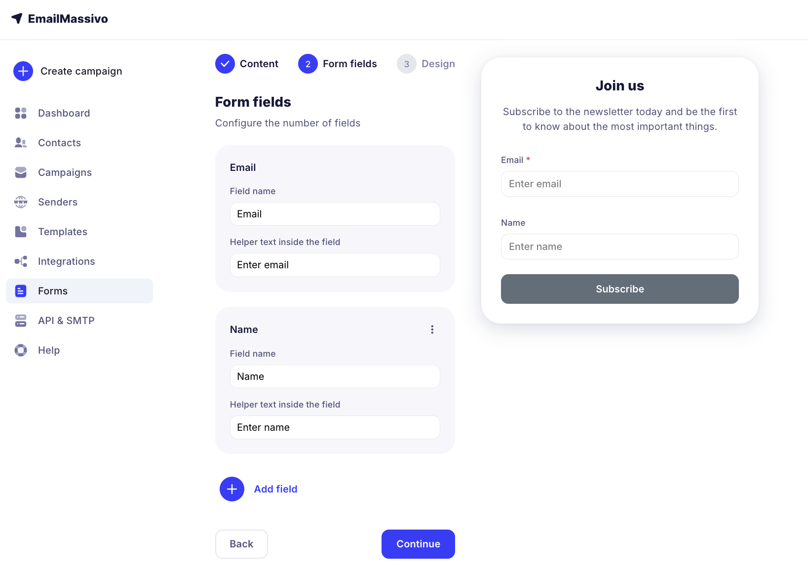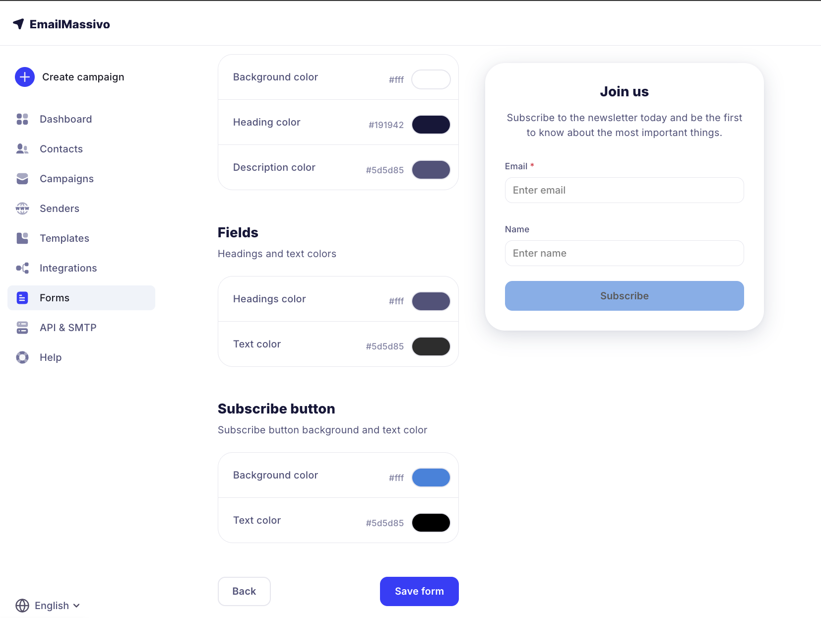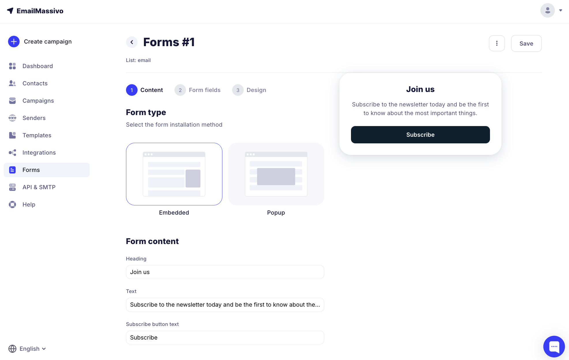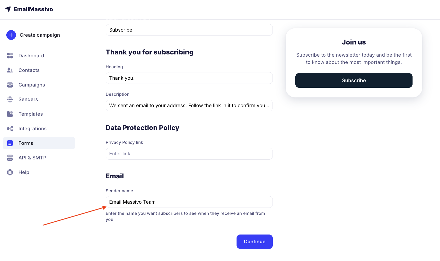 To start creating a subscription form, go to the "Forms" section and click the "Create a form" button.