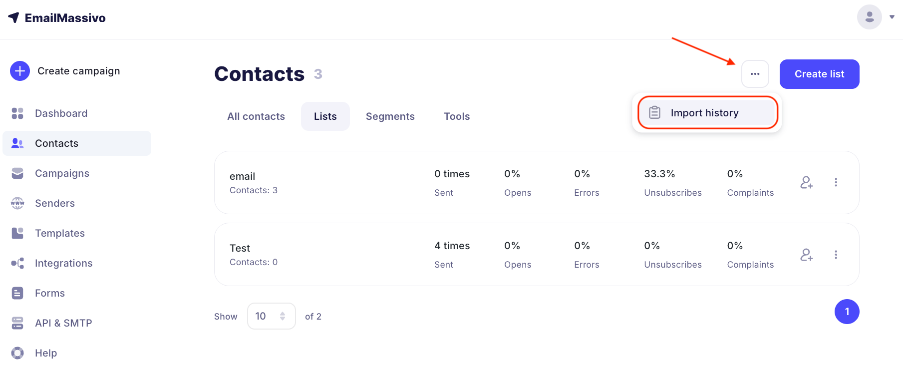 You can view the import history of unsubscribed contacts in the corresponding section: