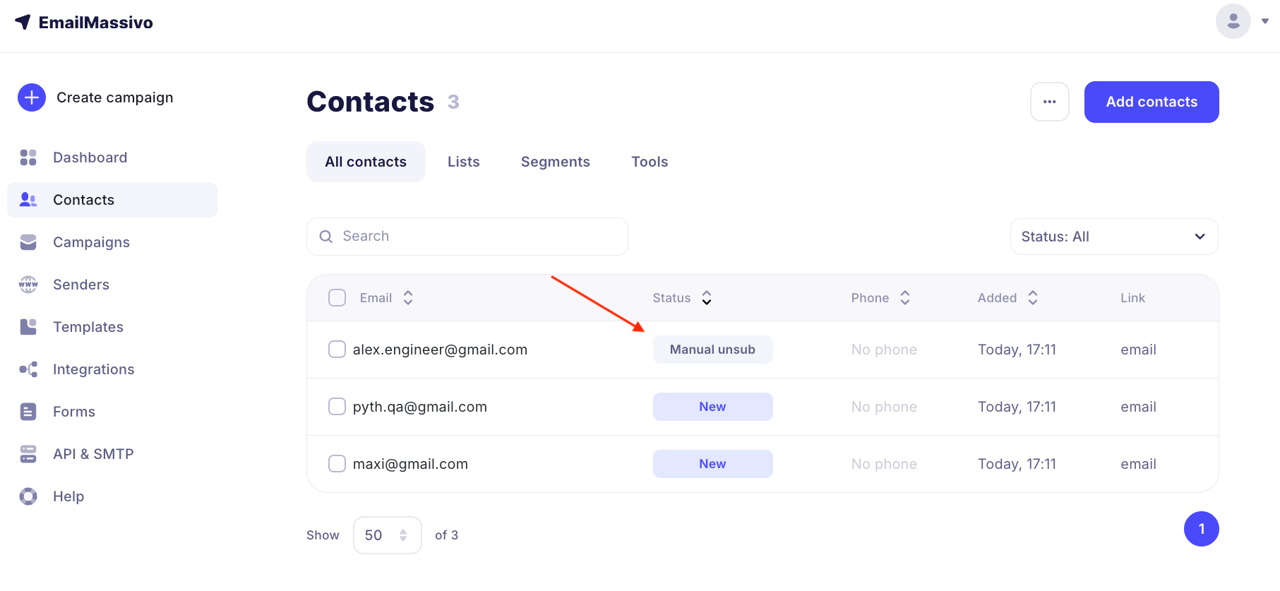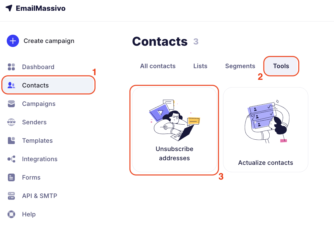 If you have your own database of unsubscribed contacts (from another source, service, or your own website) in EmailMassivo, you can independently specify addresses that need to be unsubscribed. To do this, open the "Contacts" tab and go to the "Tools" section.