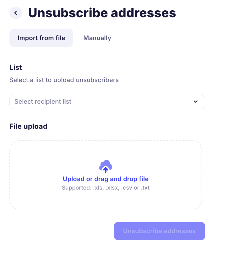 Prepare a file with the unsubscribed contacts database in TXT, CSV, XLS or XLSX format.