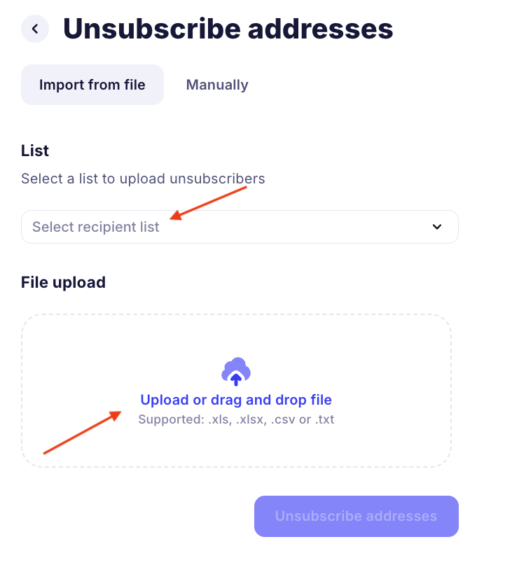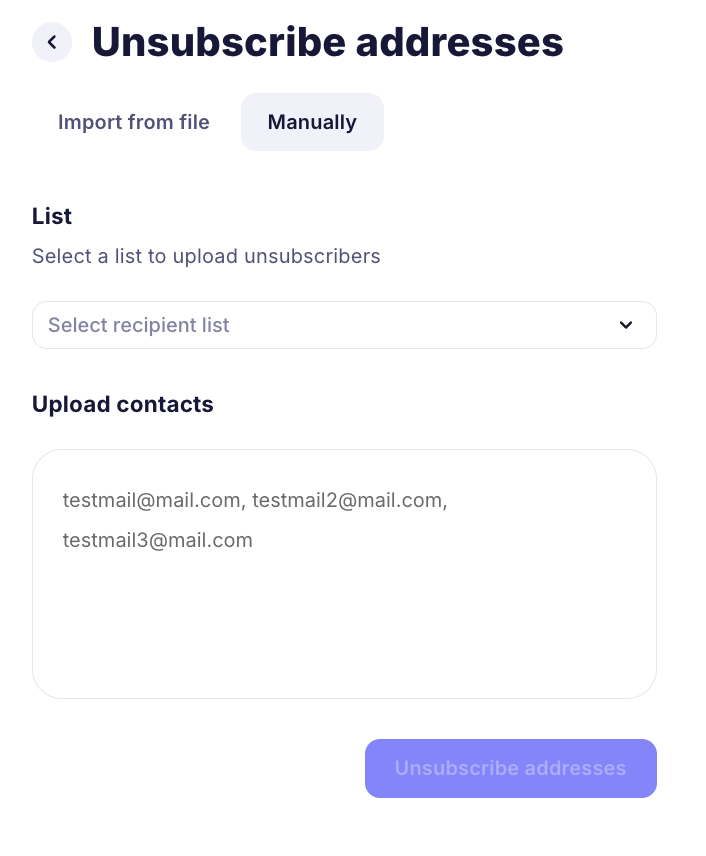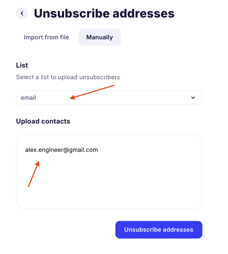When uploading unsubscribed contacts, select the "Manual" method. Add unsubscribed contacts to the "Upload Contacts" field, and also select the list where they will be placed. Write each unsubscribed contact on a new line.