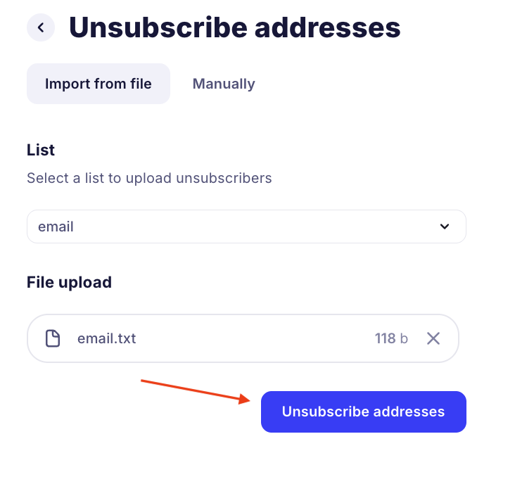 When you have uploaded the file and selected the list, click the "Unsubscribe addresses" button: