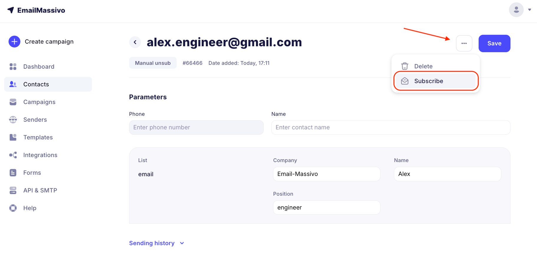 If you wish, you can resubscribe unsubscribed contacts. To do this, select the contact you want to subscribe, click on the three dots → "Subscribe":