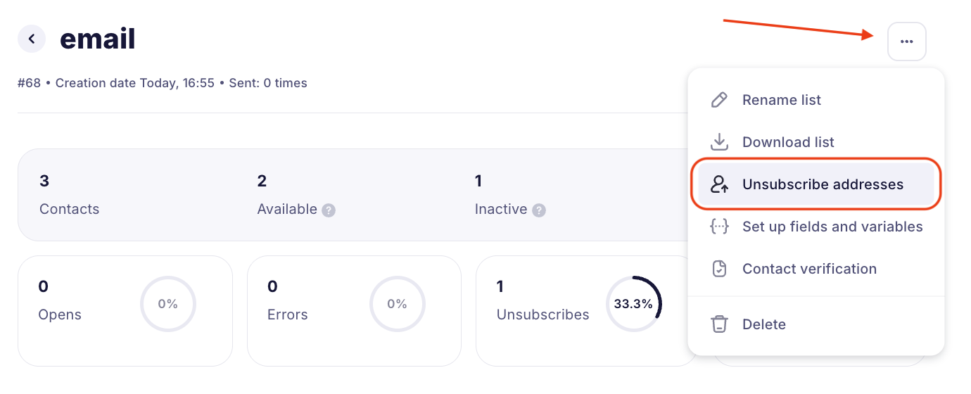 When you have added unsubscribed contacts and selected the list, click the "Unsubscribe addresses" button: