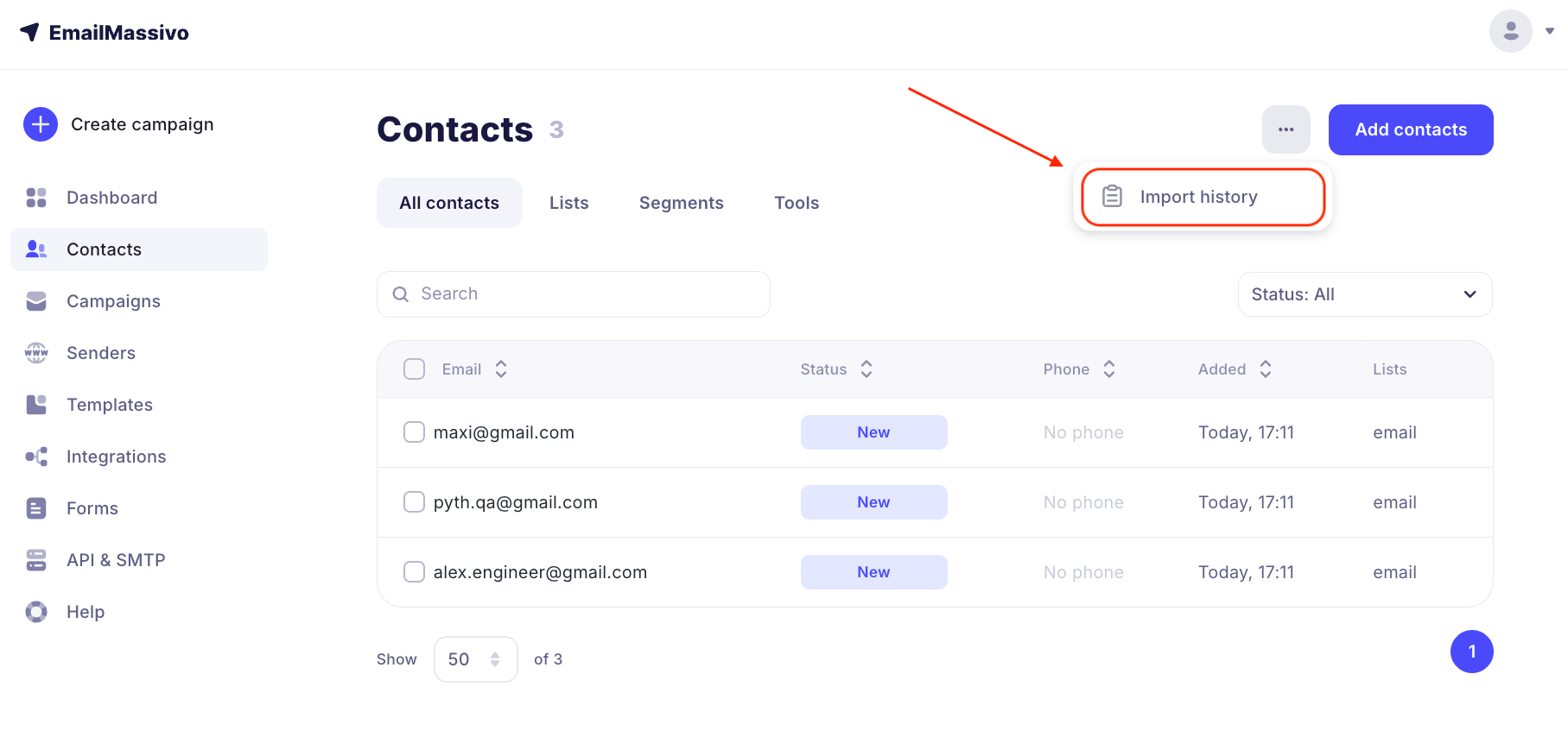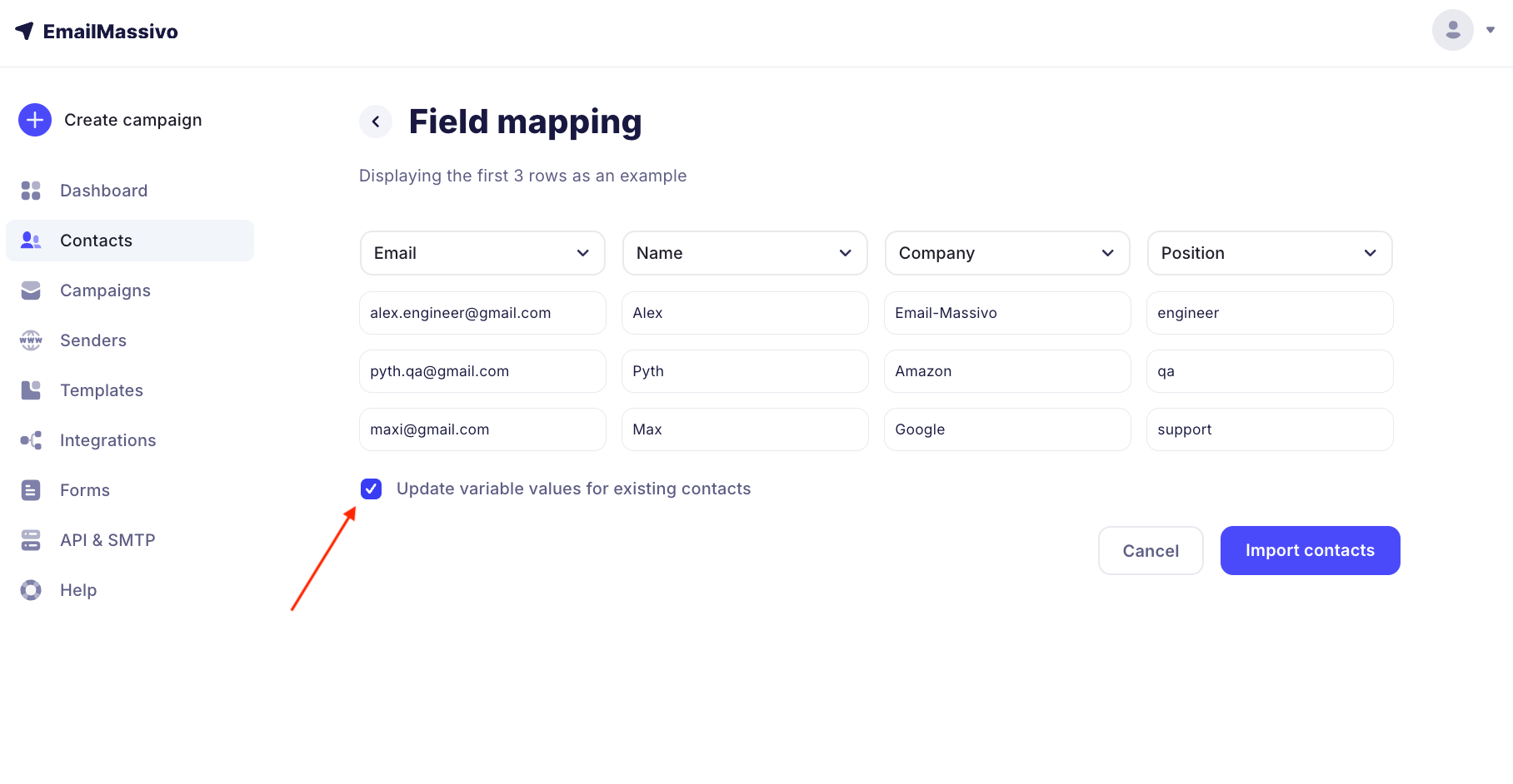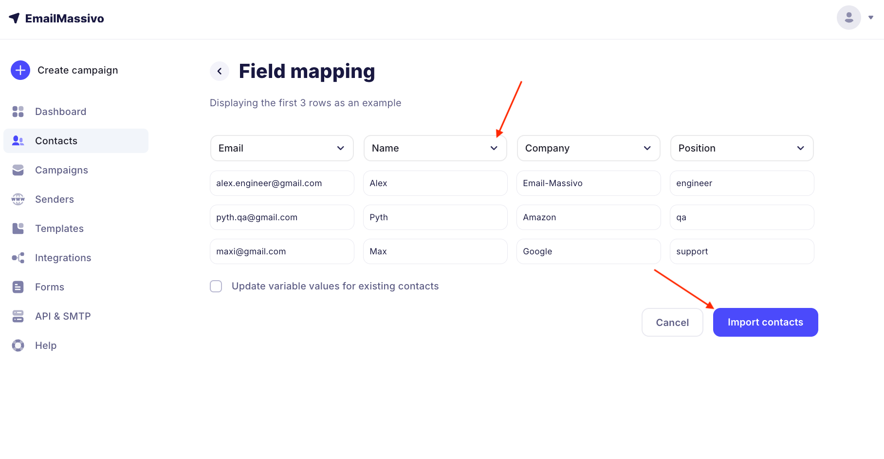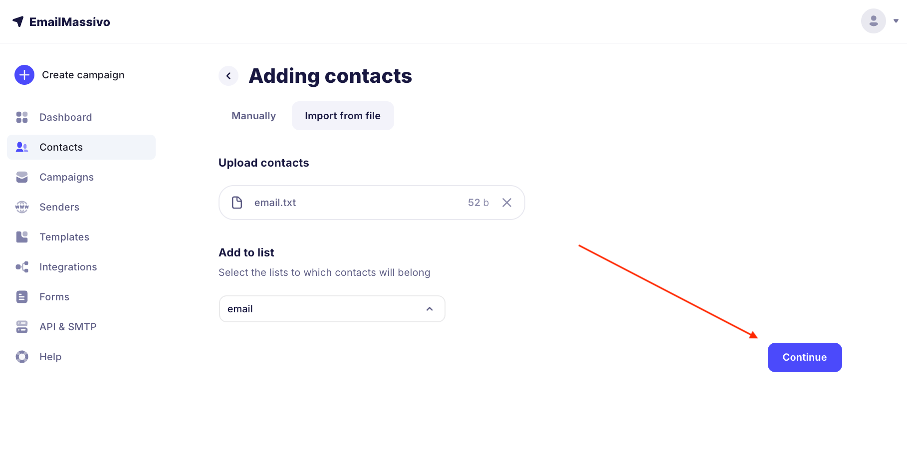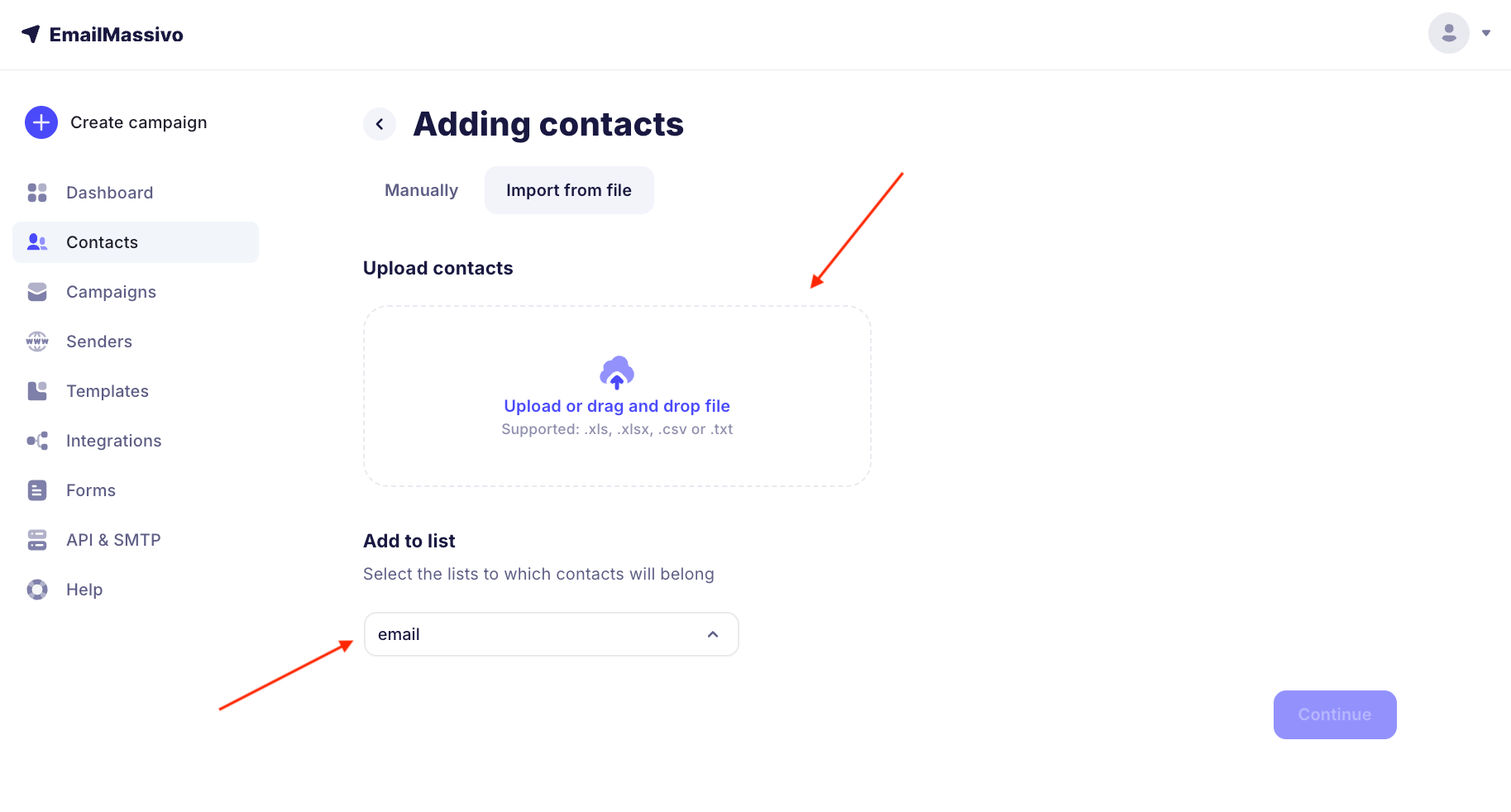 Click "Import Contacts" and select the file. You can click on the "Upload or drag file" area or drag the document with your mouse.