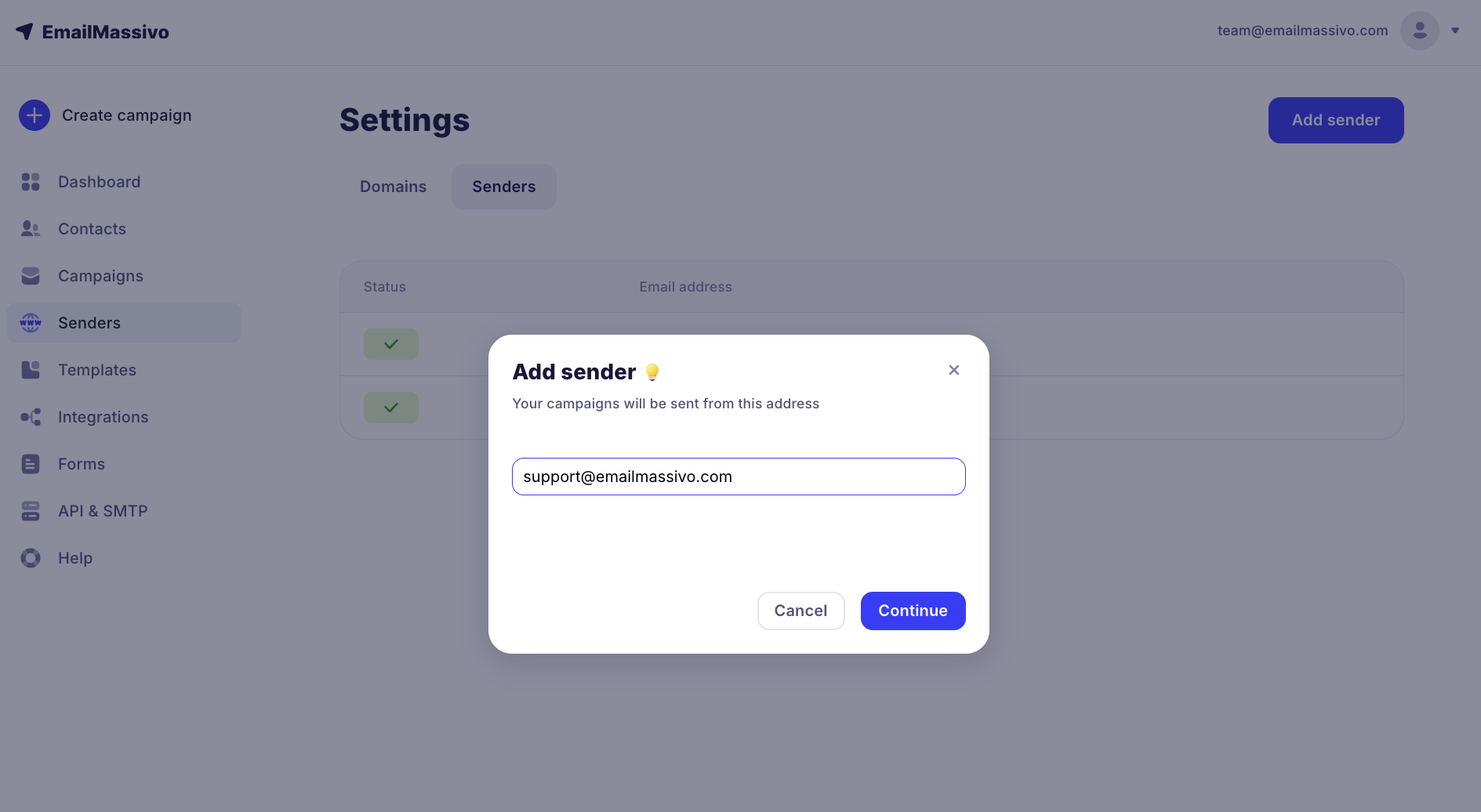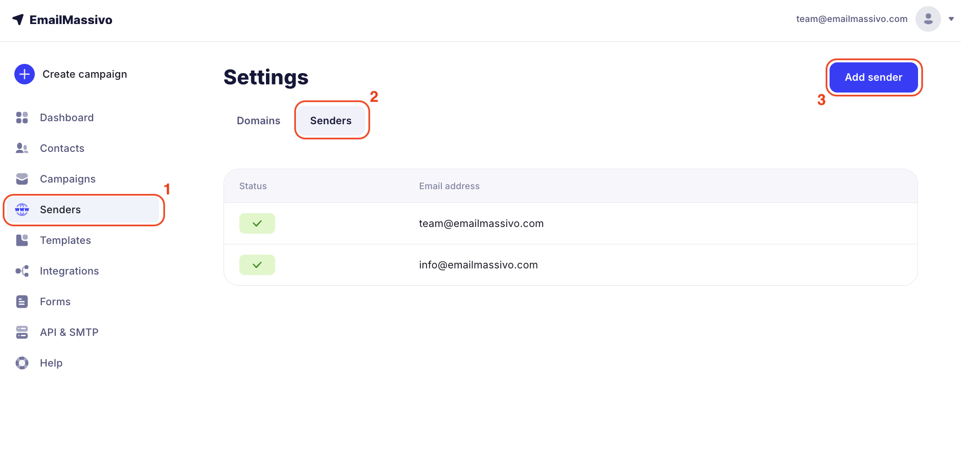 To add a new sender, you first need to add and verify your domain in EmailMassivo (read more about this in the guide), and then create an email on this domain.