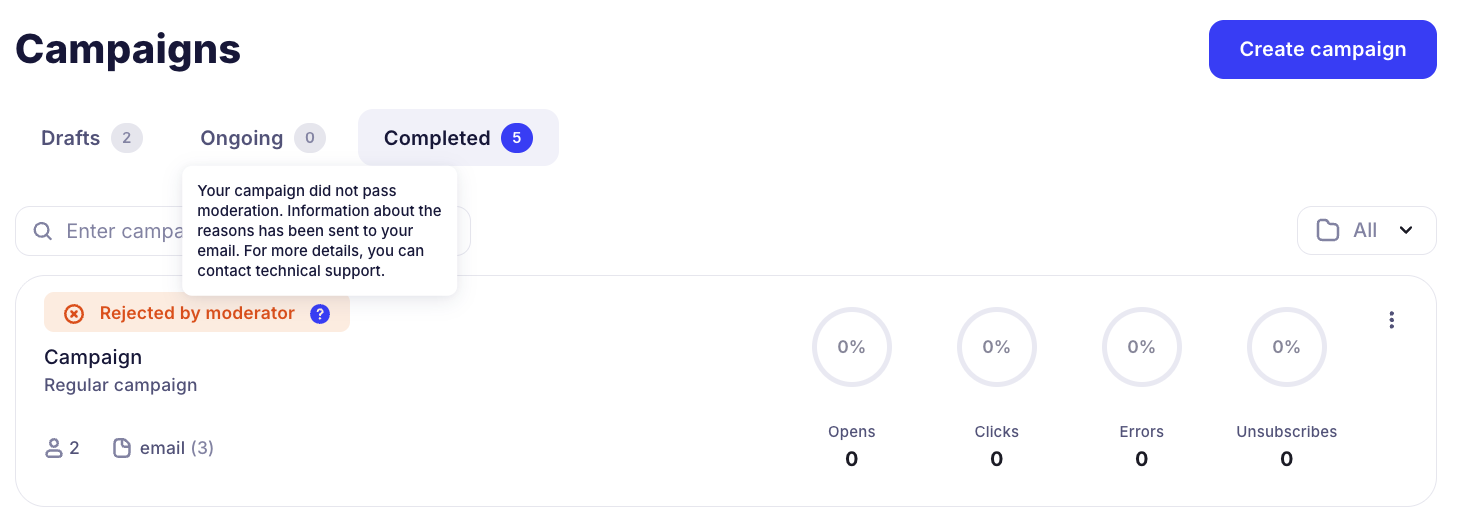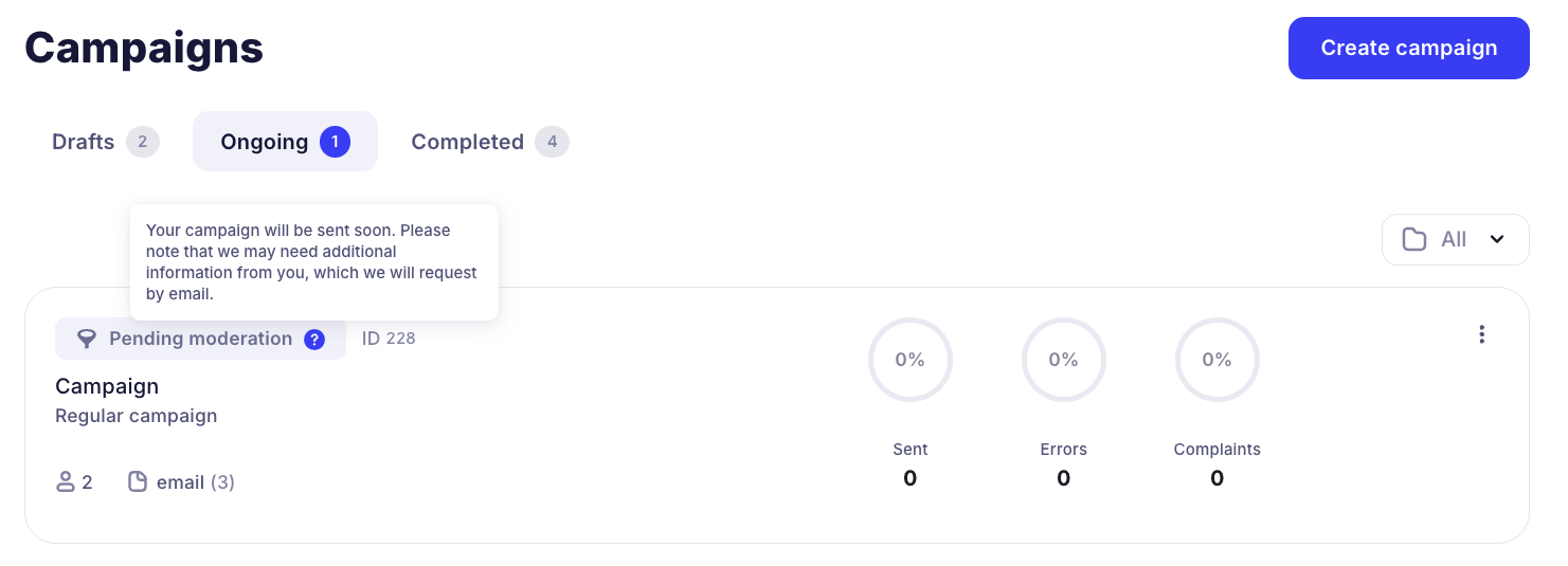 After you create a campaign and click "Send", your campaign may go to moderation so that our service support team can verify its legality or inform you about any shortcomings in its composition and check your contact database.