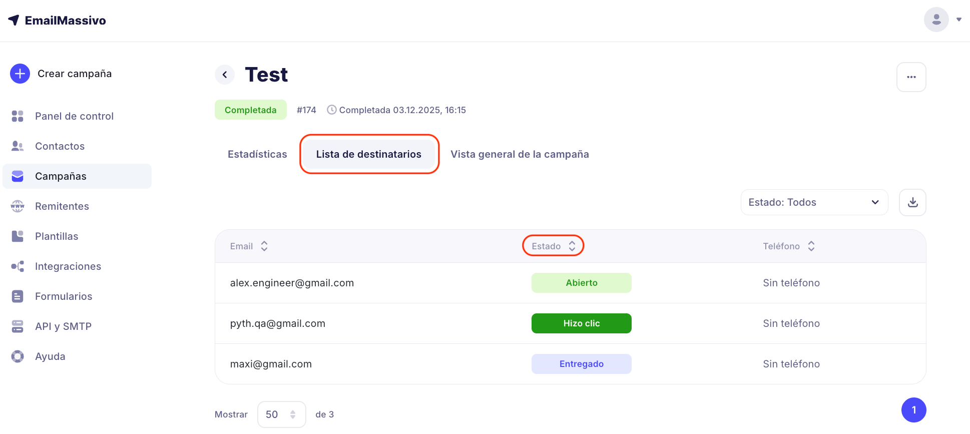 Puedes ver estos estados en campañas en progreso y completadas, en la sección "Lista de destinatarios", columna "Estado".