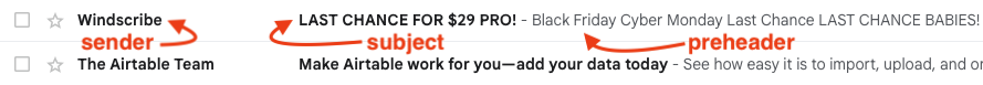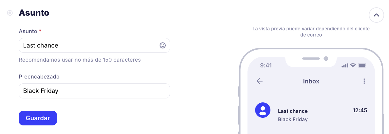 El asunto del correo electrónico es la parte del mensaje que los suscriptores ven cuando entran a la carpeta "Bandeja de entrada". Por el asunto del correo electrónico, los suscriptores juzgan si vale la pena abrirlo o no, por lo que debe ser atractivo, informativo y breve.