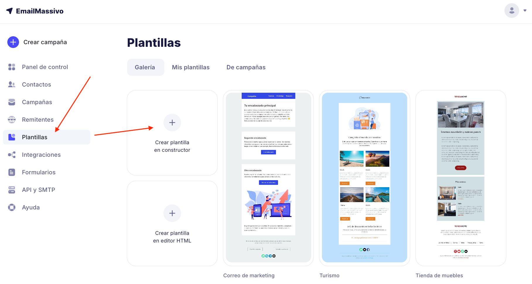 EmailMassivo proporciona varias opciones de selección de plantillas para campañas. Puedes: