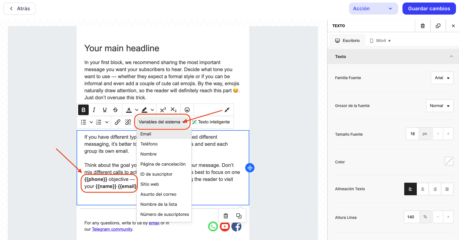 Si seleccionas una plantilla de la galería o creas una nueva, puedes insertar variables (etiquetas) así: