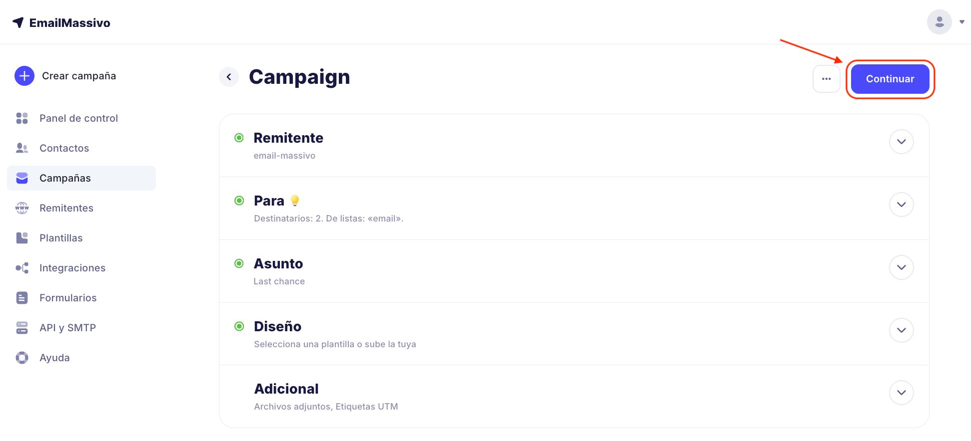 Completa la información de la campaña. Después de que todos los elementos estén completados, haz clic en "Continuar".