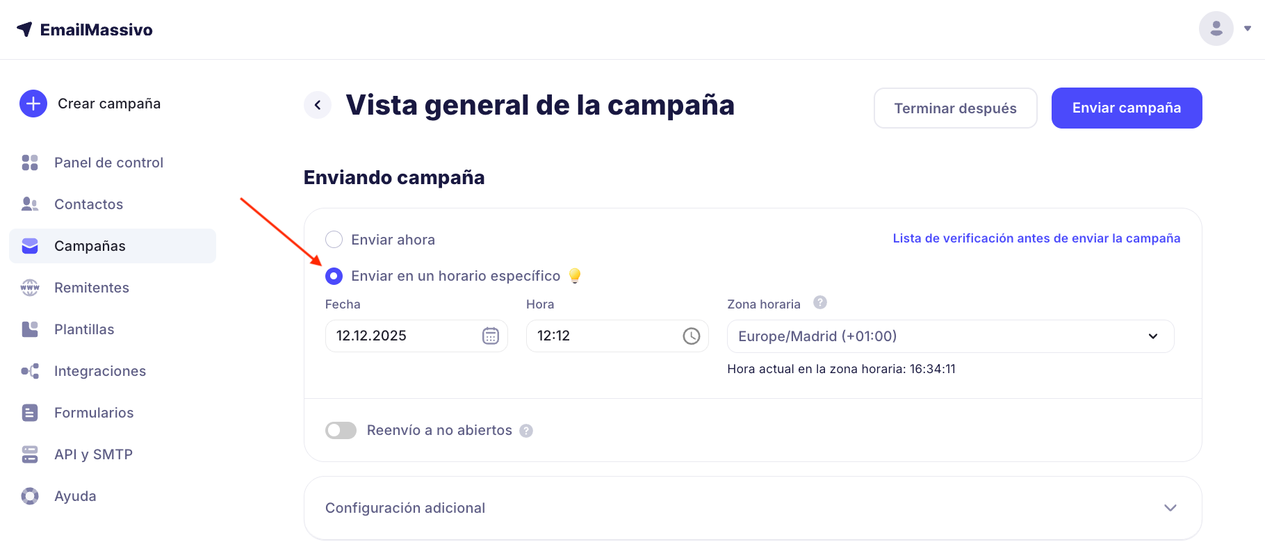 Solo puedes programar una campaña para un tiempo futuro, por lo que el sistema no permitirá programar una campaña para un tiempo que ya pasó — el botón "Enviar campaña" estará inactivo, o los valores de tiempo para horas pasadas no estarán disponibles para selección.