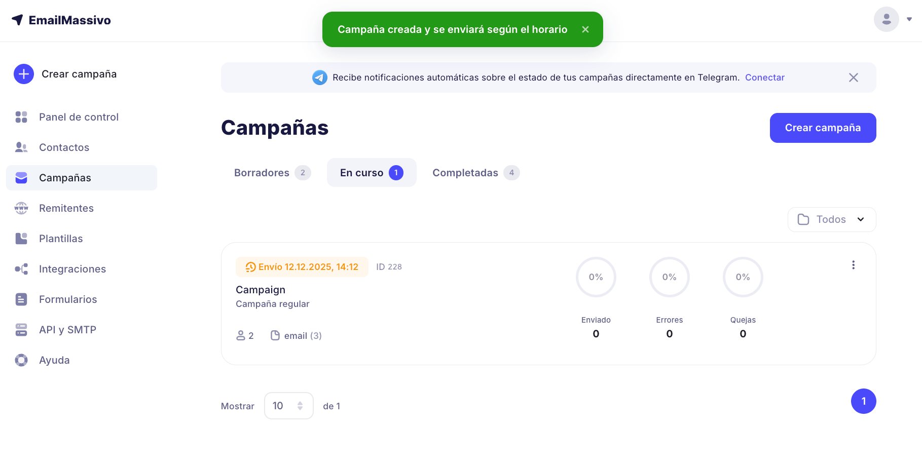 ¡Listo! La campaña ha sido creada y se enviará en la hora y fecha que especificaste: