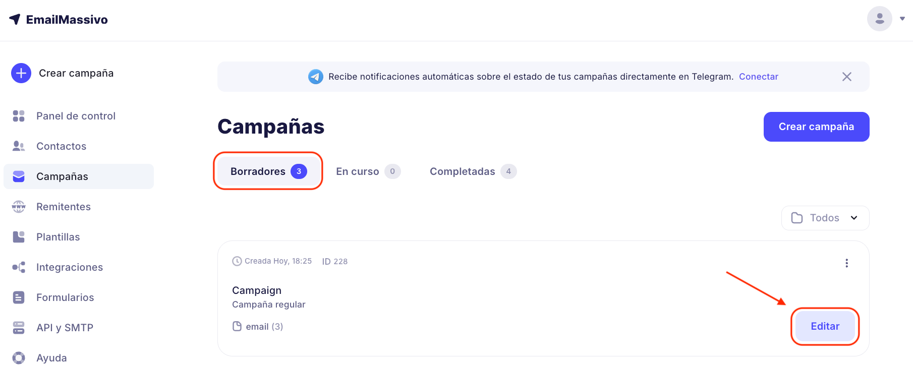 Luego ve a "Borradores", haz los cambios necesarios y programa la campaña nuevamente.