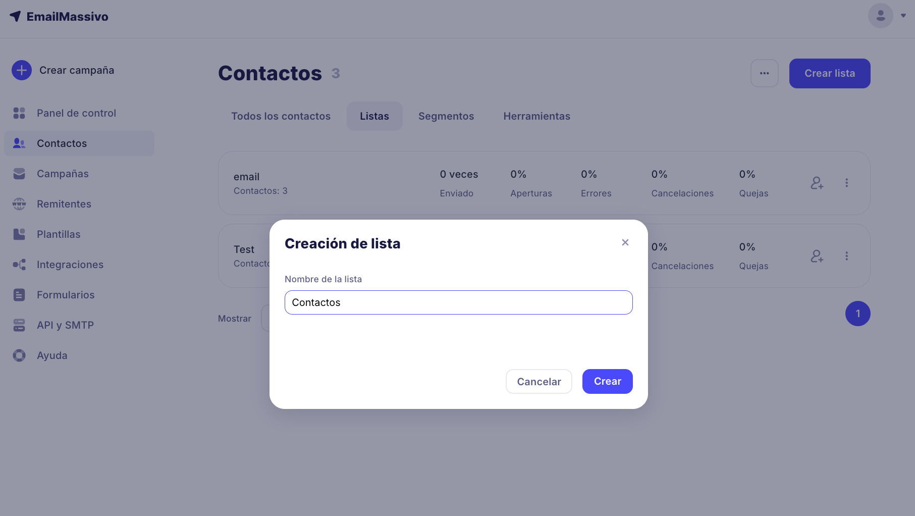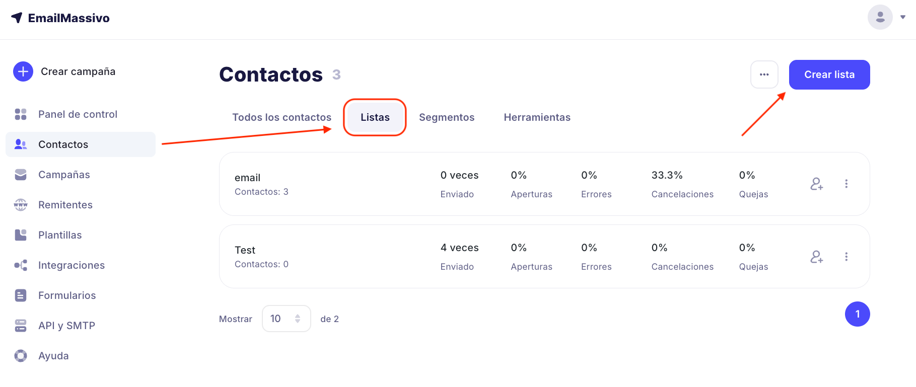 Ve a la sección "Contactos" en la pestaña "Listas" y haz clic en "Crear lista".