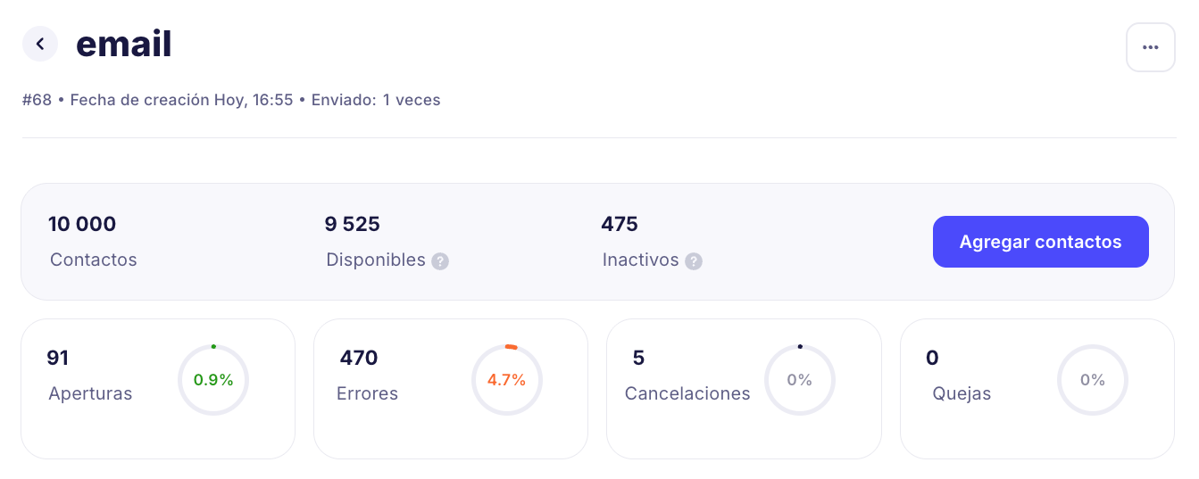 - también, dentro de una lista, puedes averiguar cuántos contactos en ella están disponibles para enviar campañas ("Activo" y "Nuevo") y cuántos contactos están "Inactivos" ("Desuscripciones", "Errores" o "Quejas")