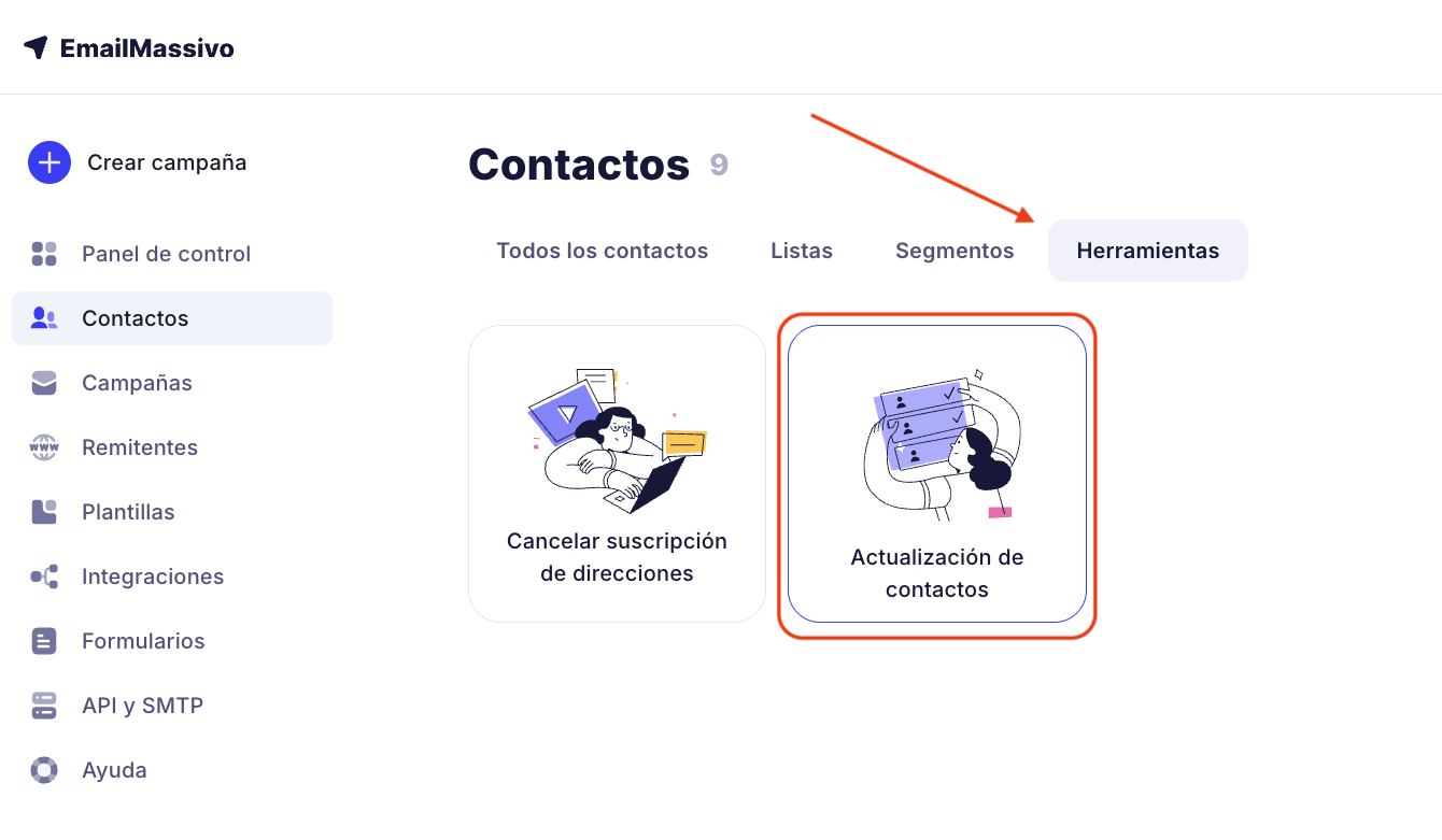 - Ve a la sección Contactos → Herramientas.