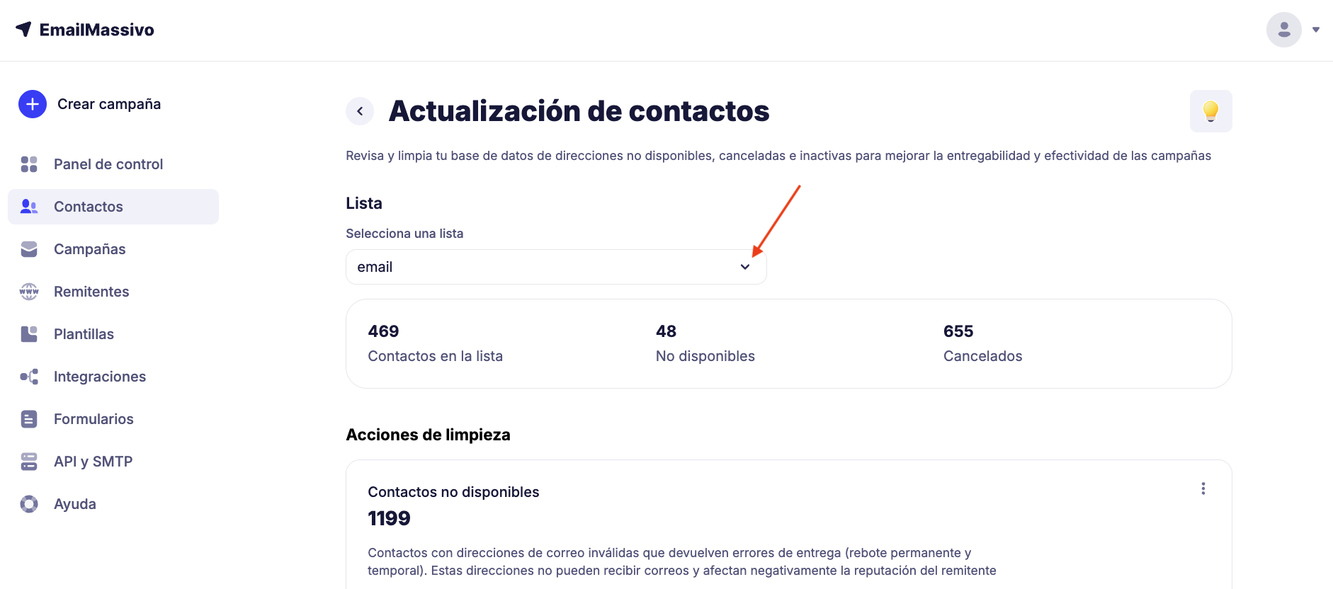 Verificación de contactos — herramienta de EmailMassivo para limpiar la base de datos de direcciones no disponibles, desuscritas y que se quejaron. La limpieza regular ayuda a mejorar la entregabilidad y la efectividad de las campañas.