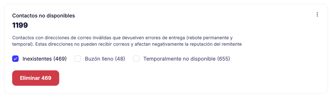 - Buzón lleno — direcciones que no aceptan correos electrónicos debido al límite del buzón.