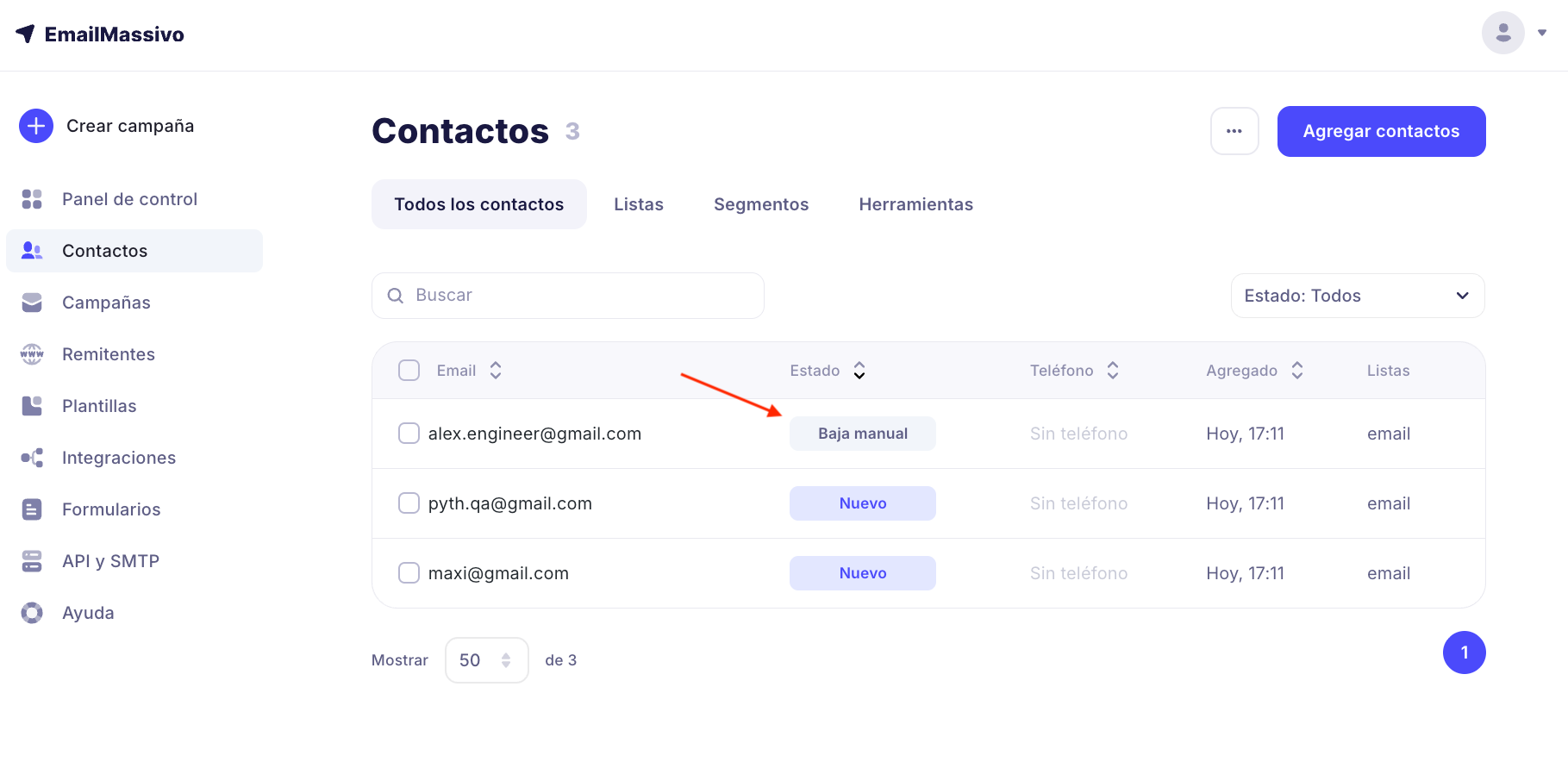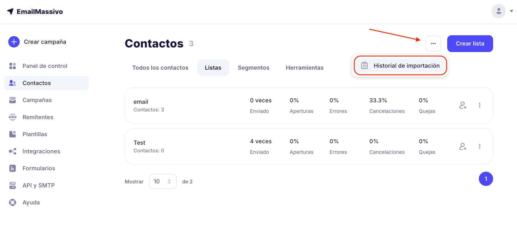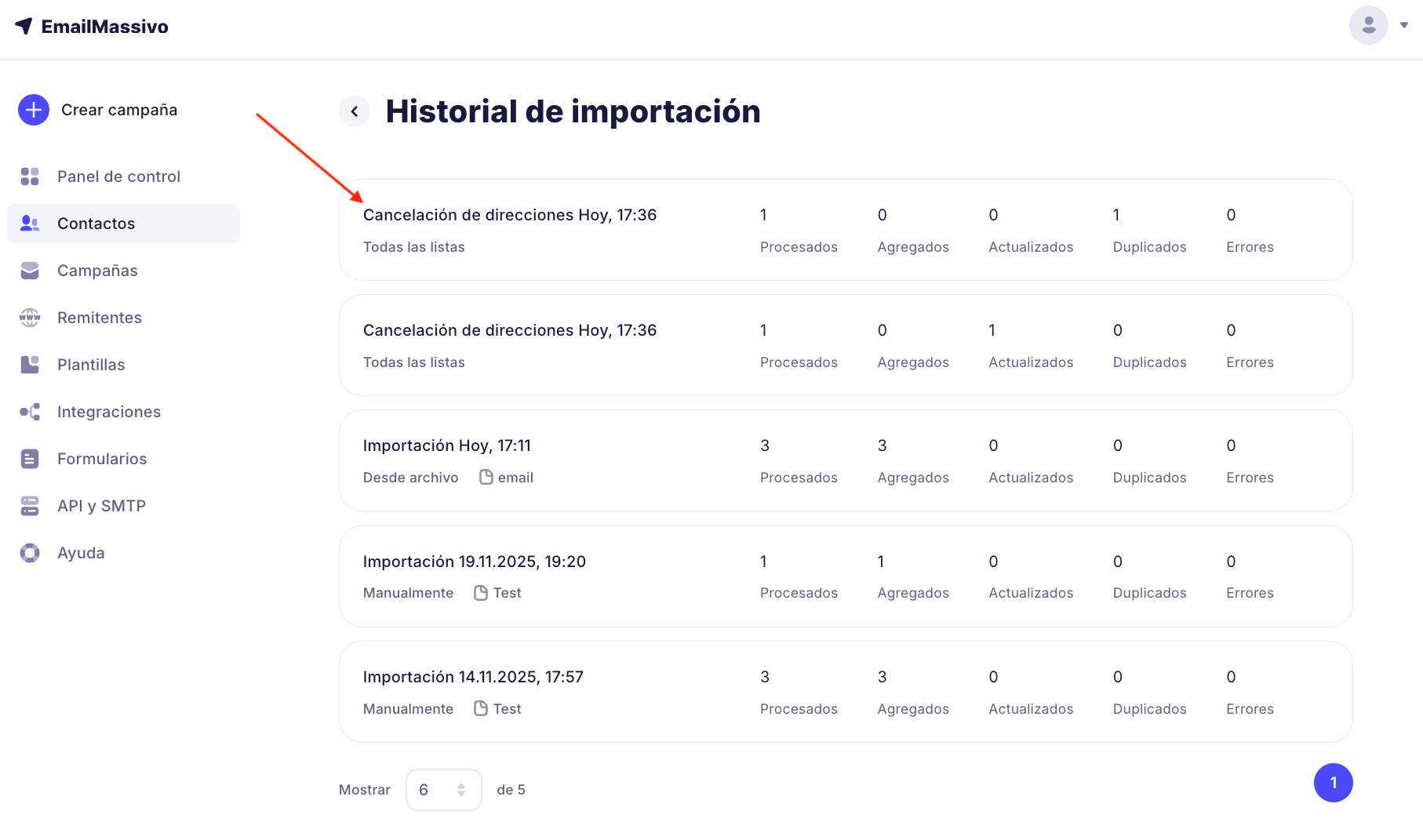 Puedes ver el historial de importación de contactos desuscritos en la sección correspondiente: