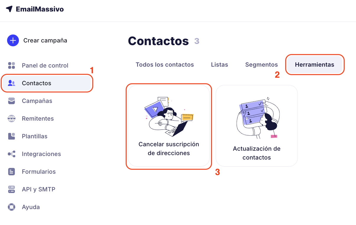Si tienes tu propia base de datos de contactos desuscritos (de otra fuente, servicio o tu propio sitio web) en EmailMassivo, puedes especificar independientemente las direcciones que necesitan ser desuscritas. Para hacer esto, abre la pestaña "Contactos" y ve a la sección "Herramientas".