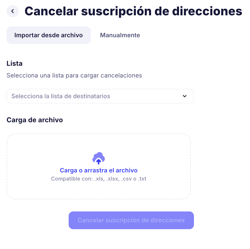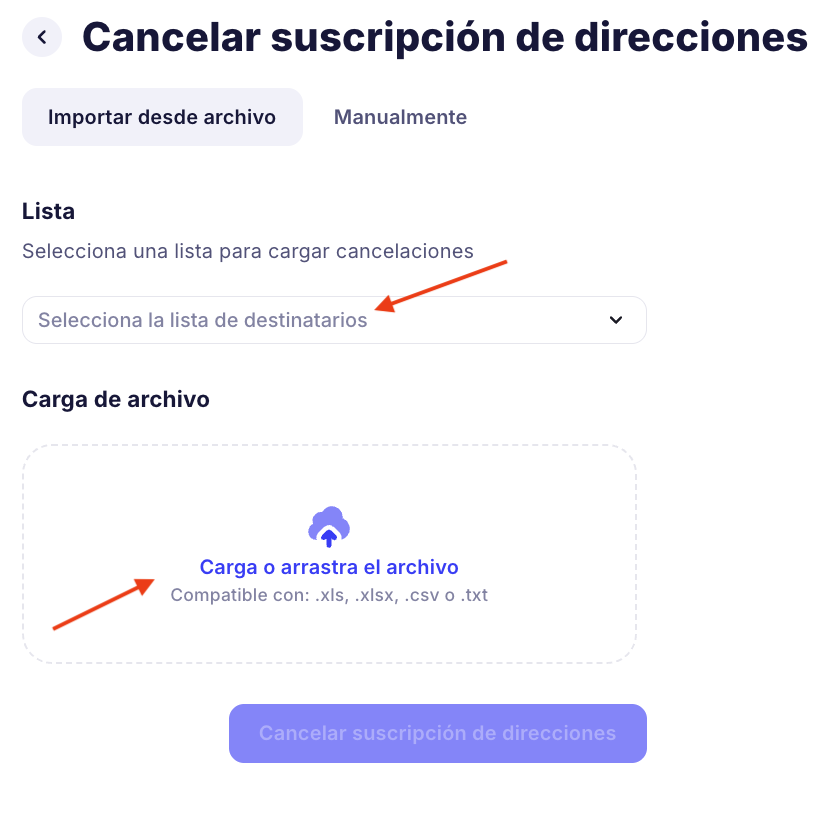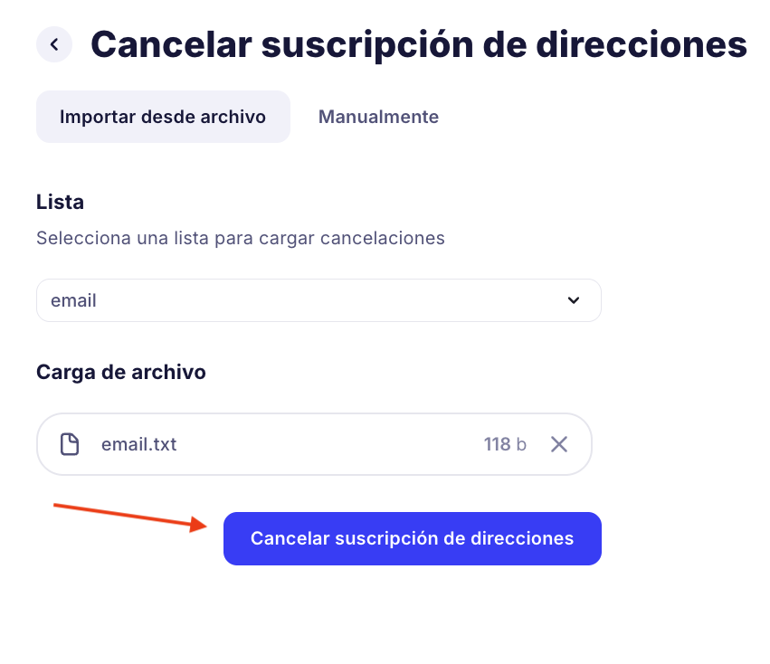 Cuando hayas cargado el archivo y seleccionado la lista, haz clic en el botón "Desuscribir direcciones":