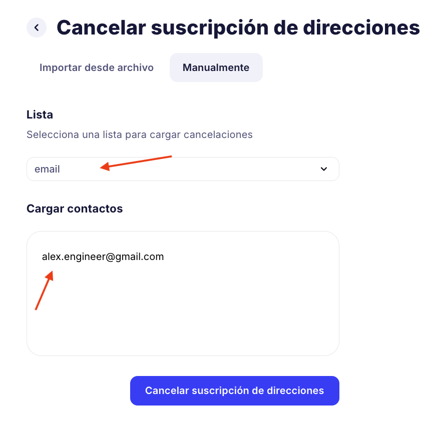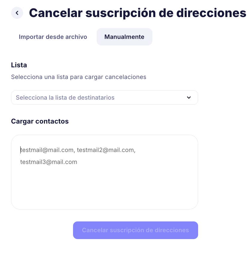 Al cargar contactos desuscritos, selecciona el método "Manual". Agrega contactos desuscritos al campo "Cargar contactos", y también selecciona la lista donde se colocarán. Escribe cada contacto desuscrito en una nueva línea.