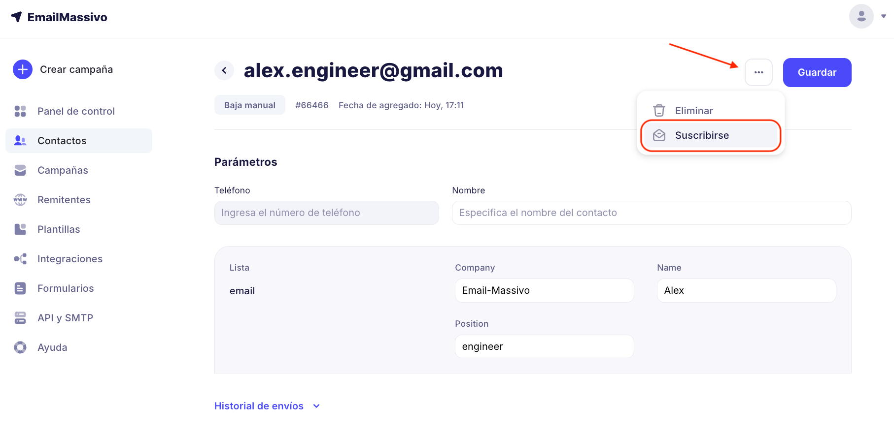 Si lo deseas, puedes volver a suscribir contactos desuscritos. Para hacer esto, selecciona el contacto que quieres suscribir, haz clic en los tres puntos → "Suscribir":