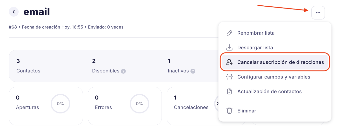 Selecciona la lista de destinatarios para cargar contactos desuscritos.