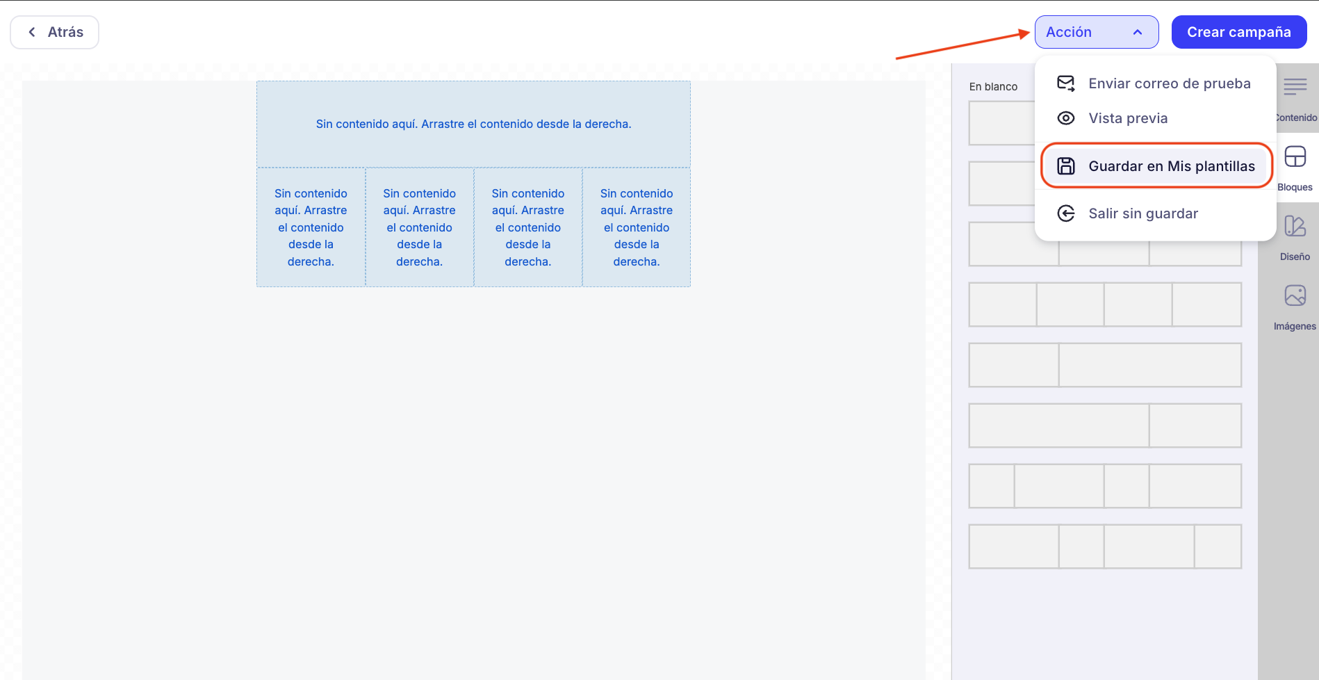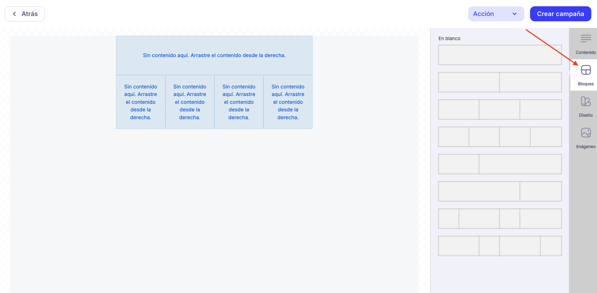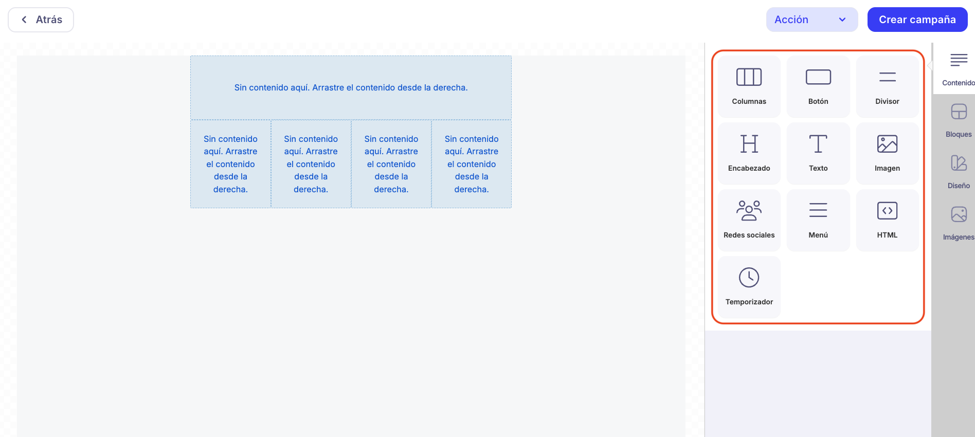 En la barra de herramientas a la derecha en la sección "Content", estarán disponibles los elementos que puedes agregar al e-mail: