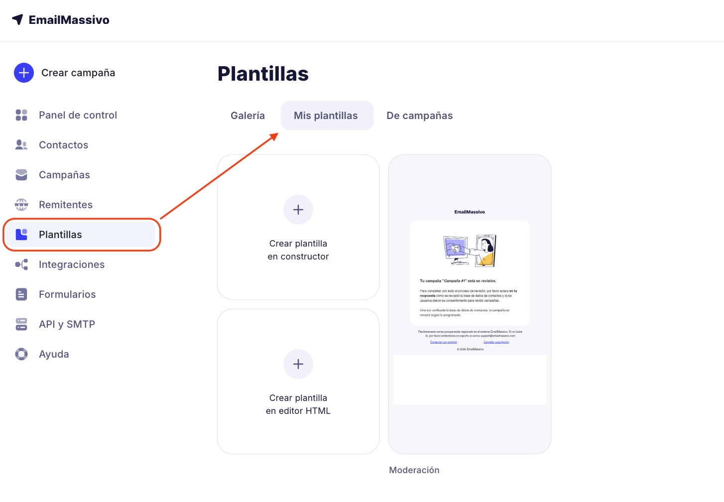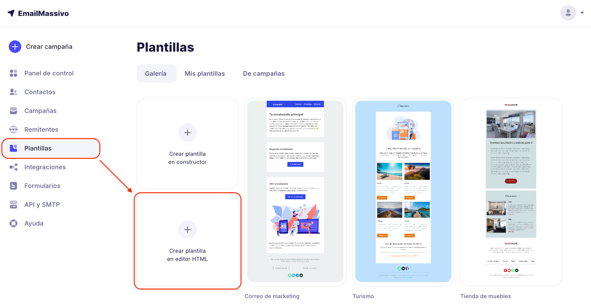 Para crear una plantilla HTML en EmailMassivo, ve a la sección «Plantillas» → «Crear plantilla en editor HTML».