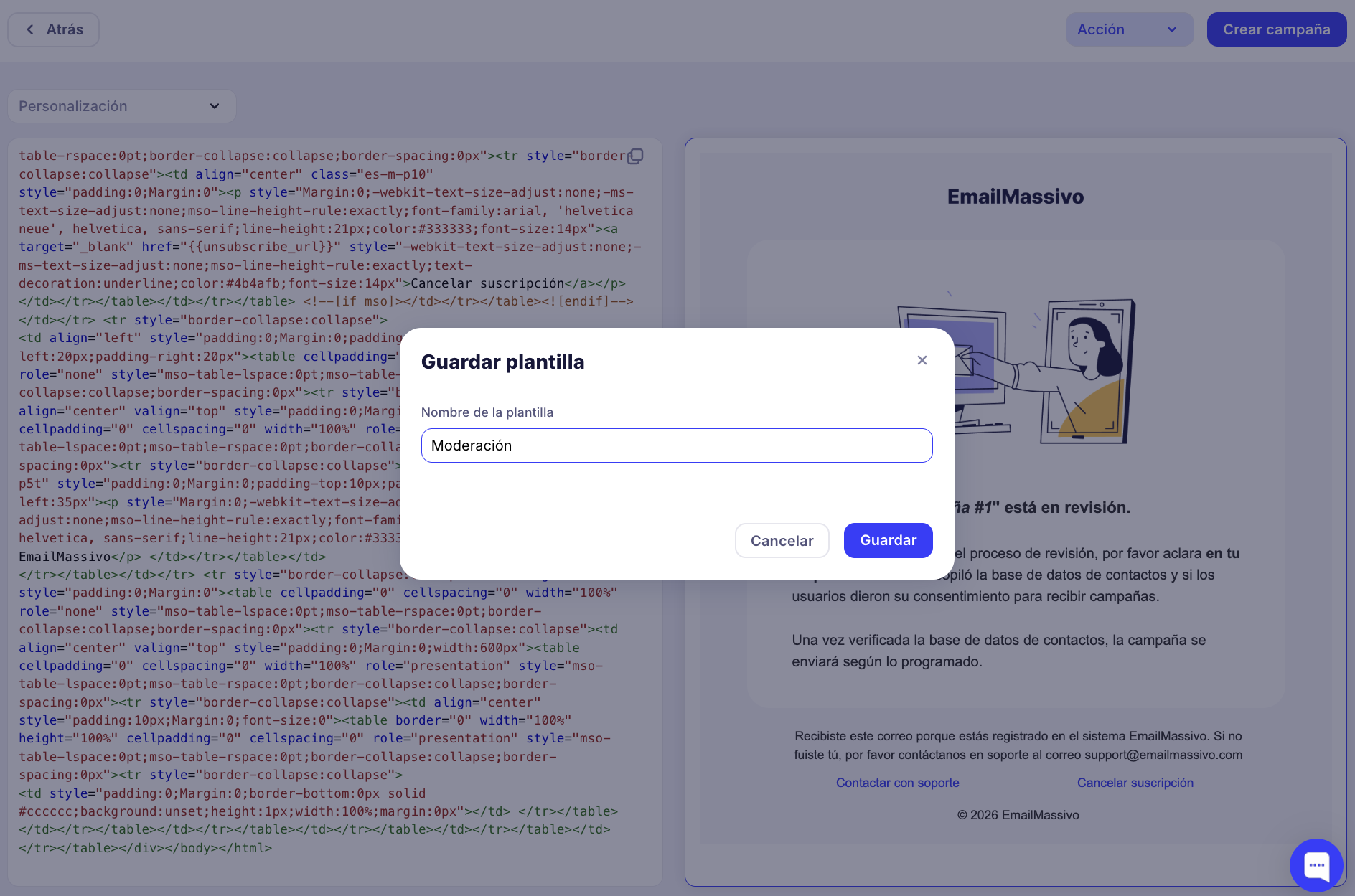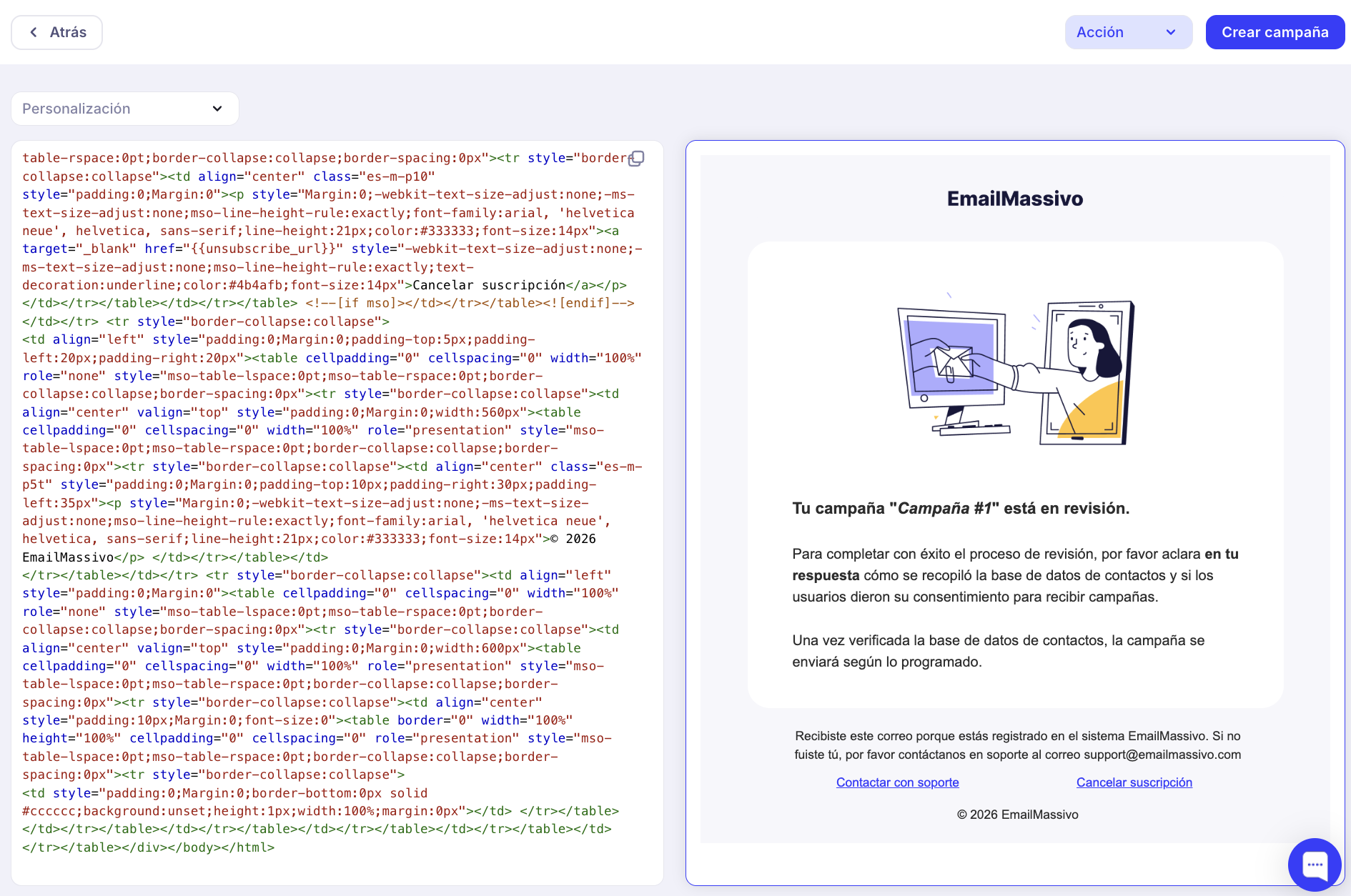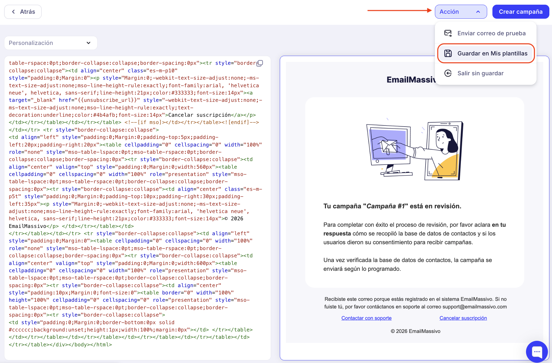 Además de crear un correo en el constructor de correos integrado, EmailMassivo te permite cargar tu plantilla HTML y usarla para envíos de campañas o correos API.