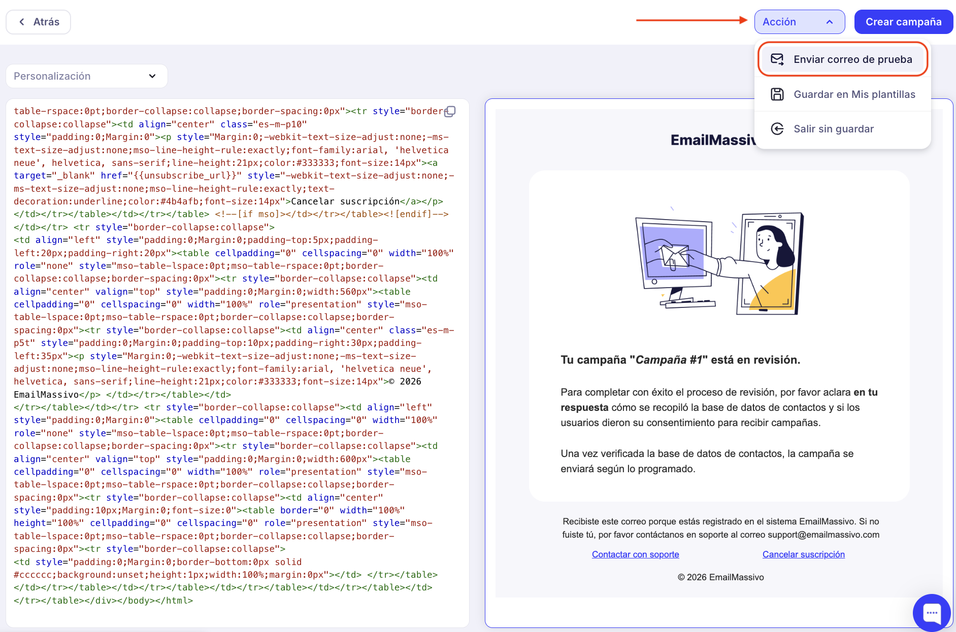 Es especialmente importante probar los correos HTML. Puedes enviarte un correo de prueba a tu correo electrónico para ver cómo se ve. Para hacer esto, haz clic en el botón «Acciones» → «Enviar correo de prueba».