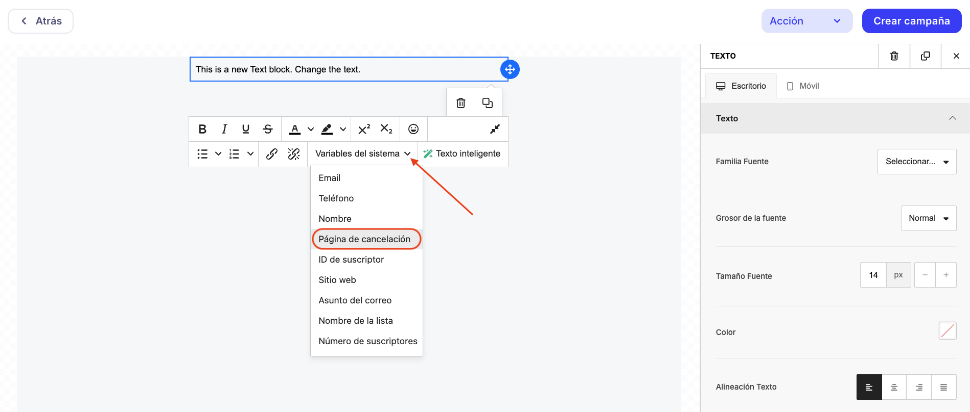 Puede insertar un enlace de cancelación de suscripción usando el elemento "Text" en cualquier bloque de correo electrónico, pero la mayoría de las veces se agrega al pie de página.