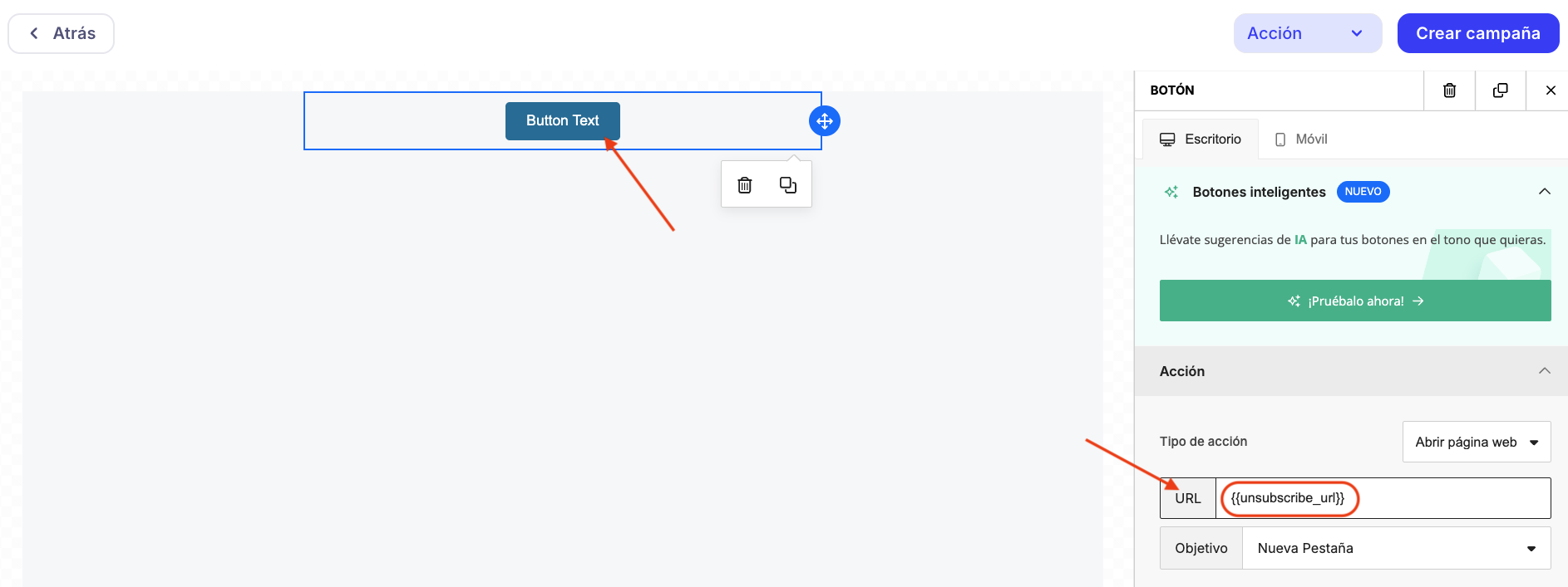 Para agregar un enlace de cancelación de suscripción como botón, puede usar el elemento "Button". Para que el botón funcione correctamente, seleccione el tipo de acción "Open Website" y especifique la macro {{unsubscribe_url}} en el campo URL.