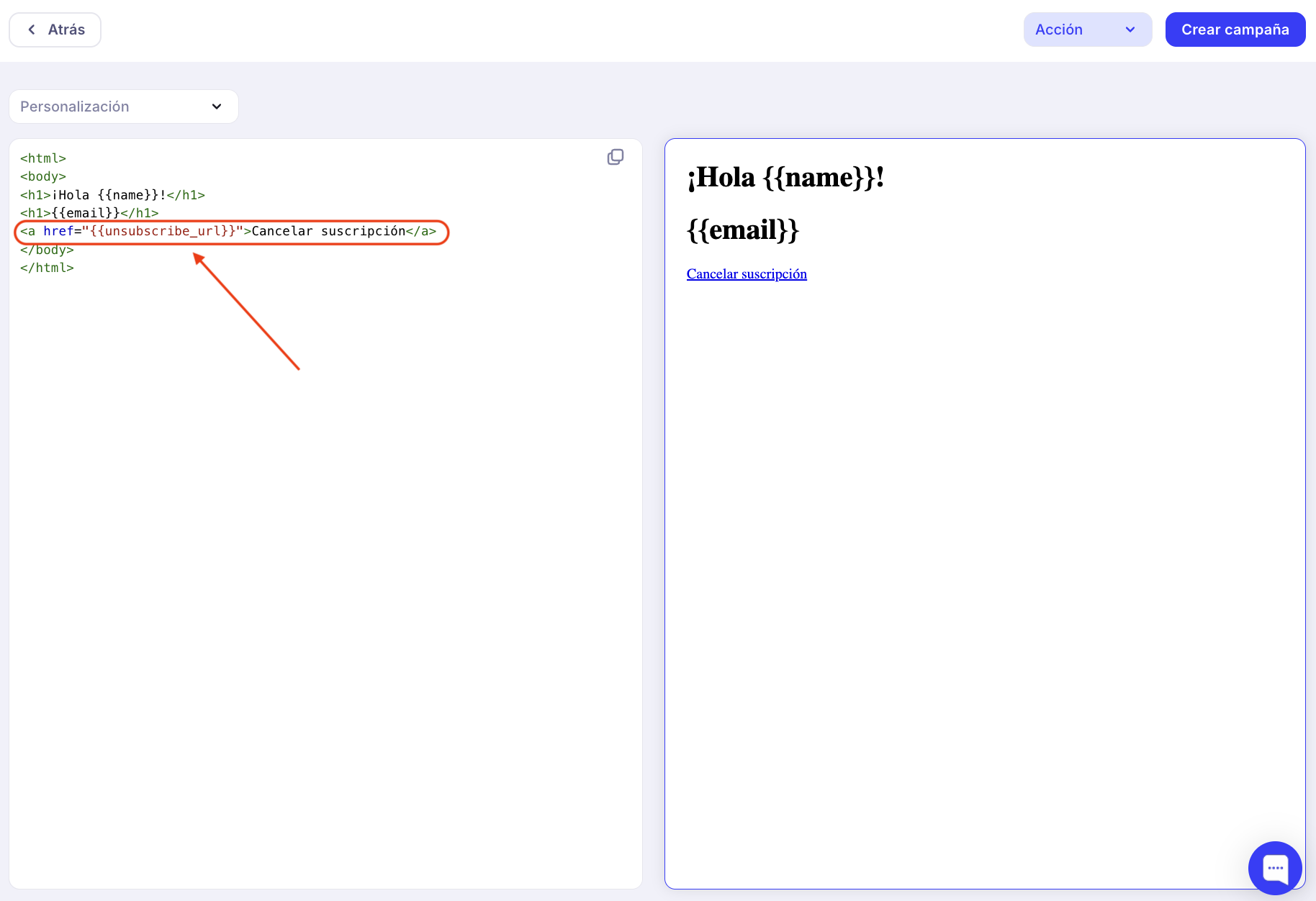 Para agregar un enlace de cancelación de suscripción a una campaña en una plantilla HTML, debe especificar la variable del sistema {{unsubscribe_url}} en el atributo href del enlace.