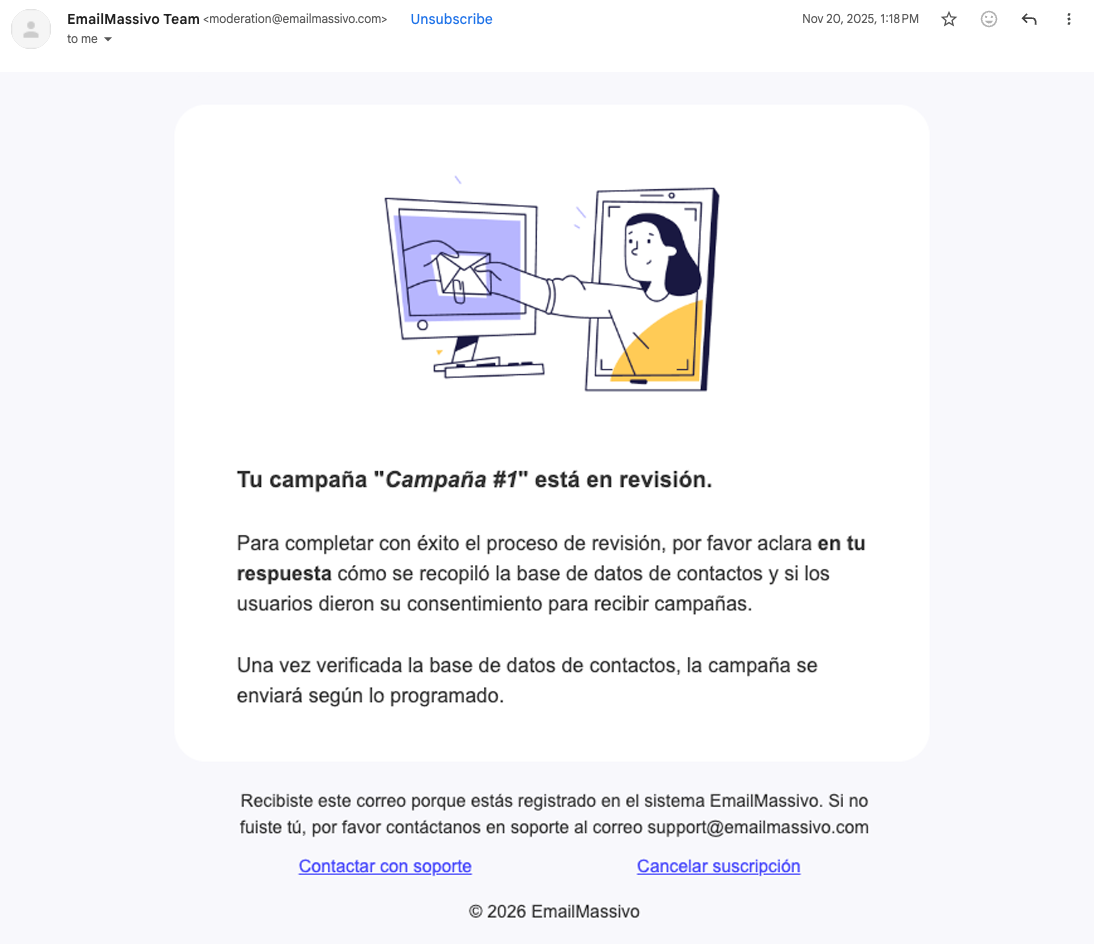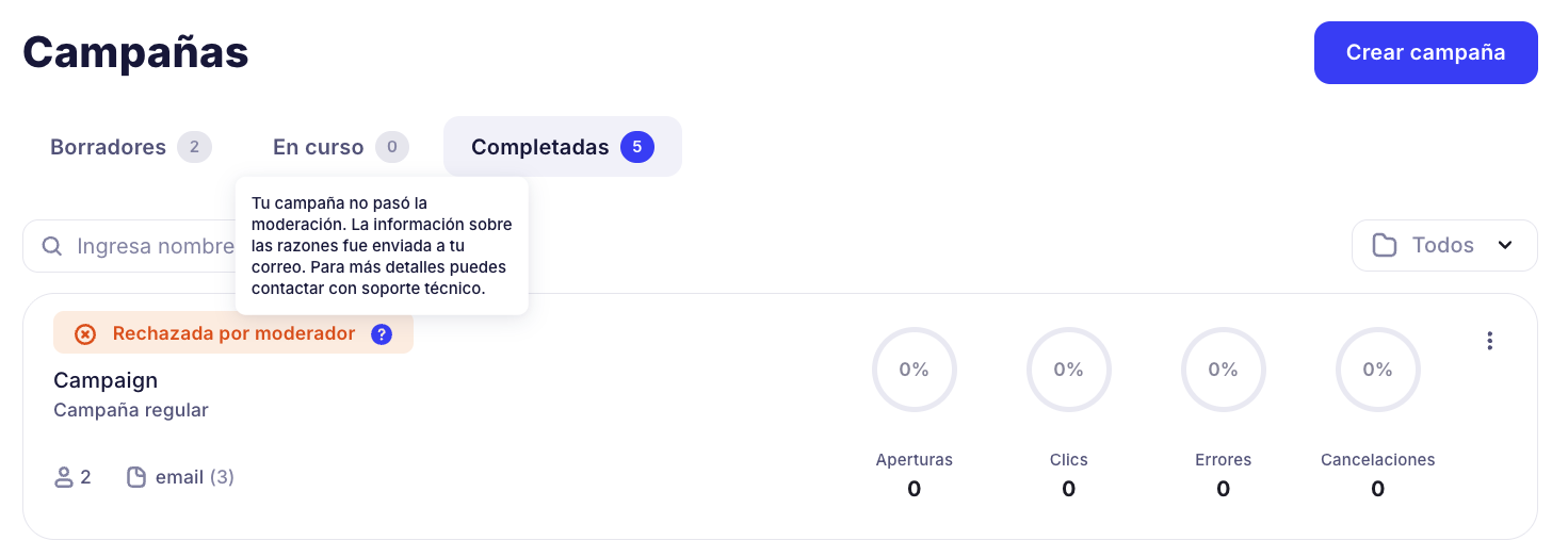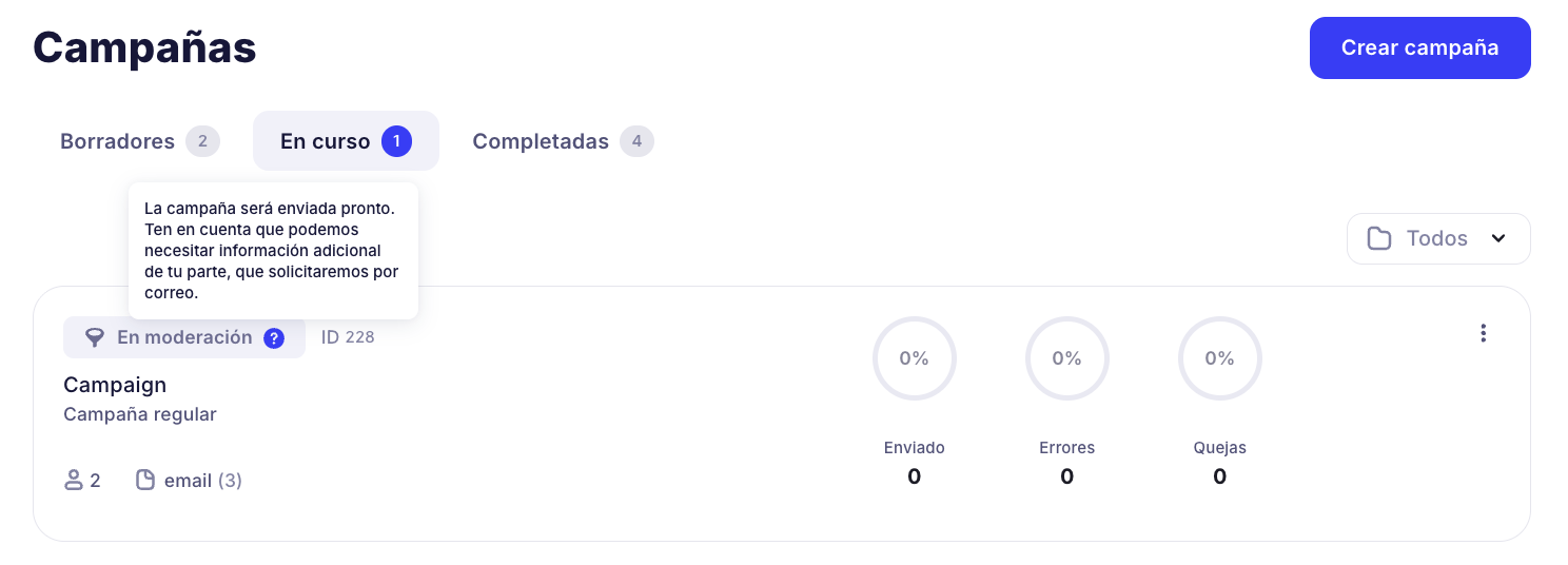 Después de crear una campaña y hacer clic en "Enviar", tu campaña puede ir a moderación para que nuestro equipo de soporte del servicio pueda verificar su legalidad o informarte sobre cualquier deficiencia en su composición y verificar tu base de datos de contactos.